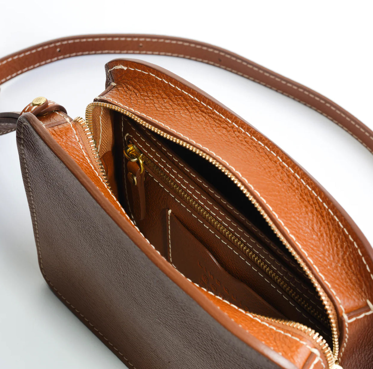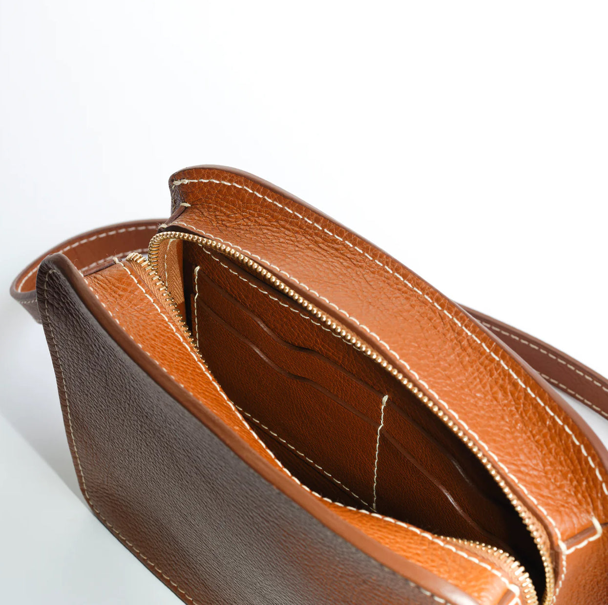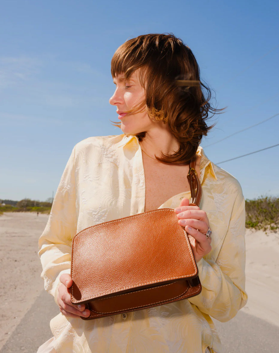 Anni features a brass double zipper top closure, and has three separate interior compartments, five credit card pockets and a zipper pocket. Organized, elegantly minimalist and squarely compact, Anni has an adjustable length strap with solid brass buckle that allows for wear high across the chest, over the shoulder or lower as a traditional crossbody.