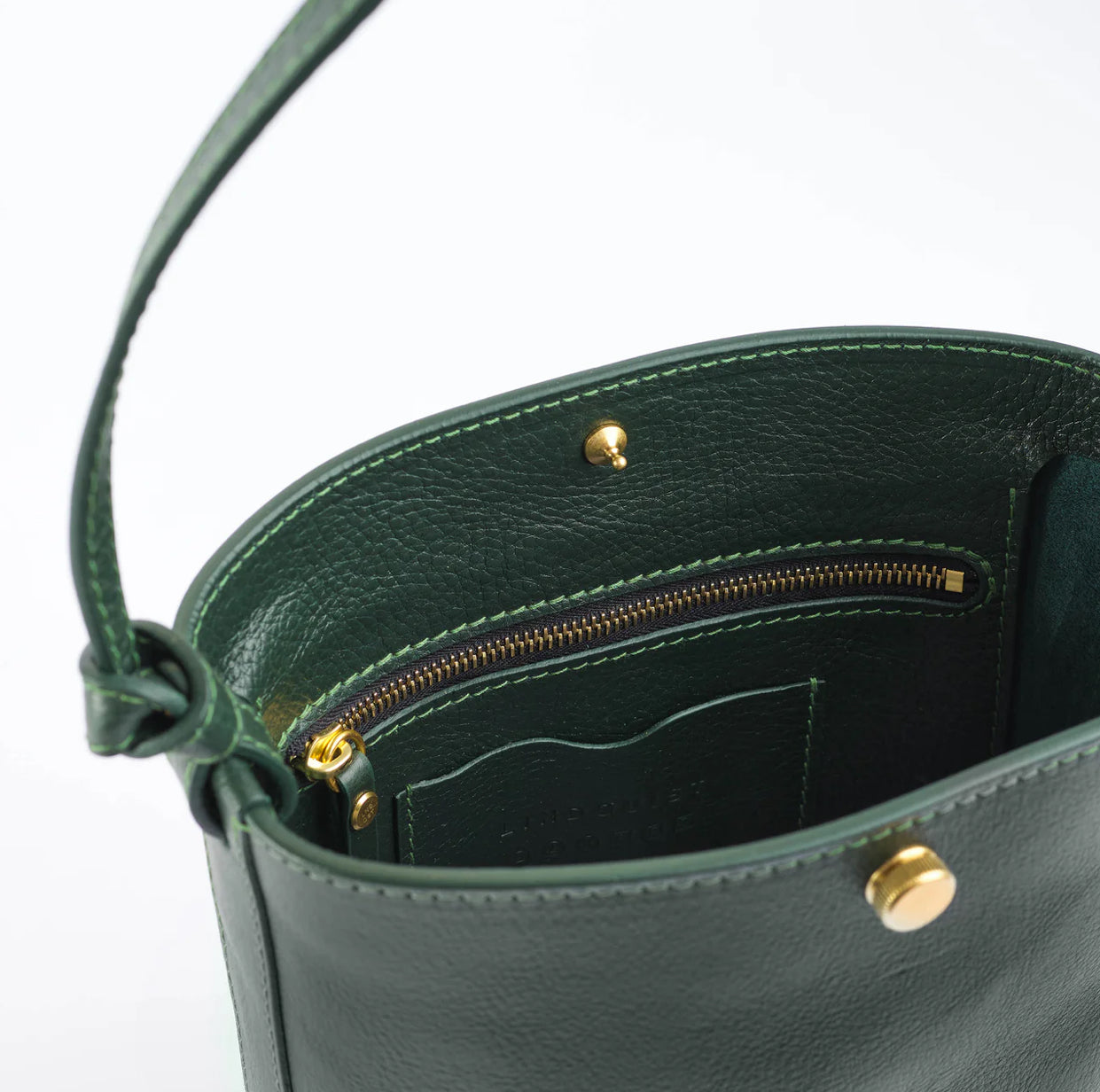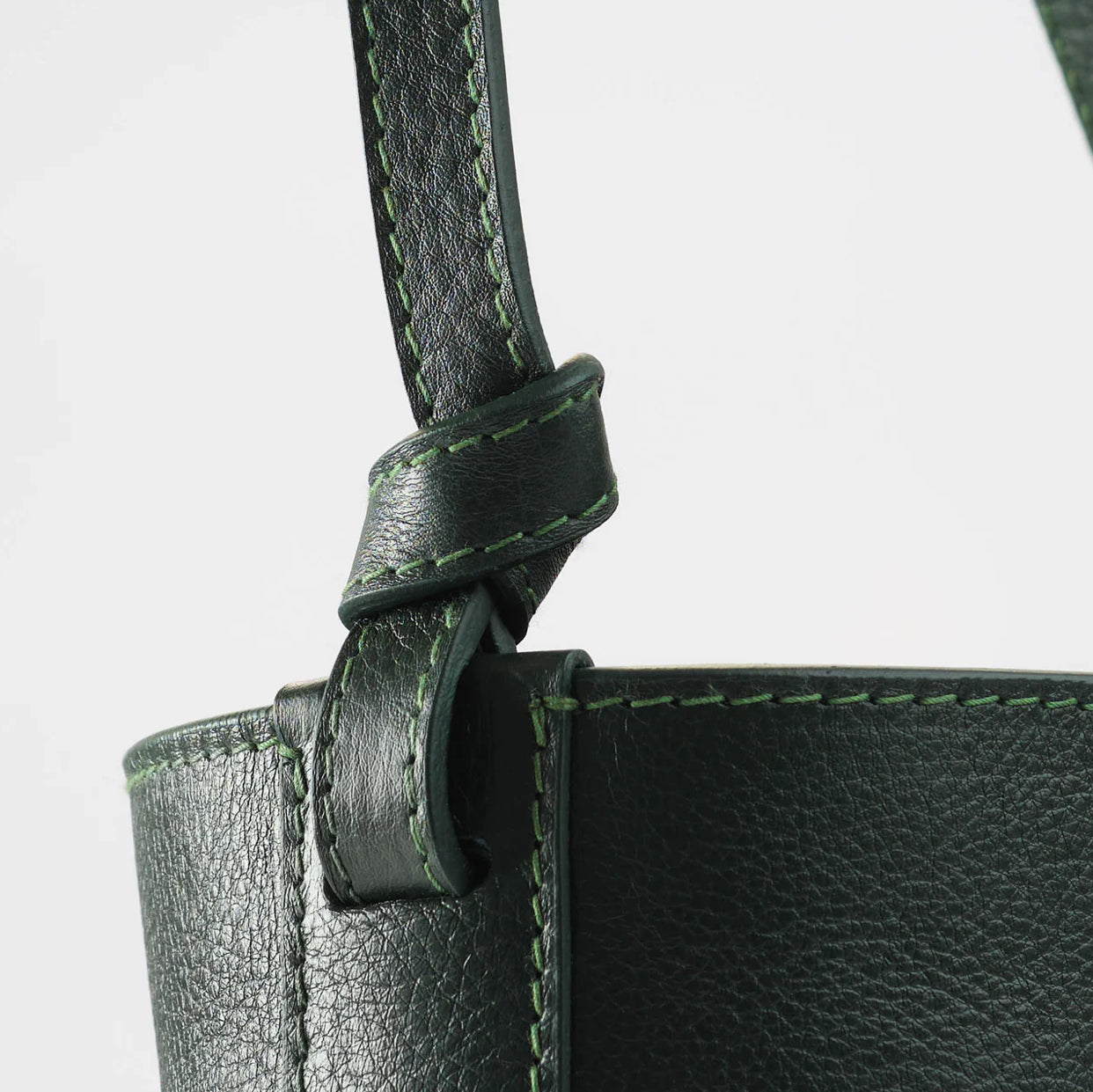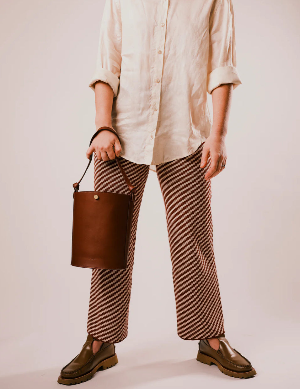 Hilma takes the shape of an oblate ellipsoid with gradual widening at the top, and features a hand knotted strap, drop pocket with zipper and card slot, and a custom knurled knob brass pull release closure.