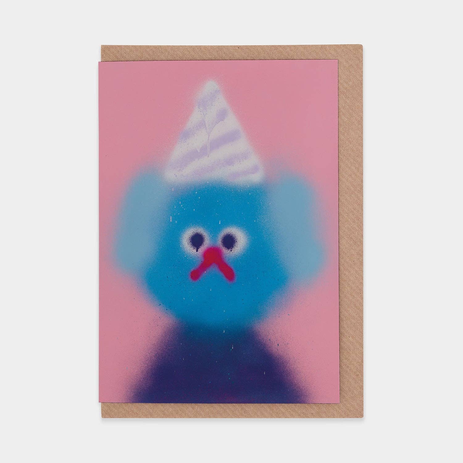 A greetings card by New York-based artist Jon Burgerman, part of the "You Met Me at a Very Strange Time in My Life" series originally exhibited at L21 Gallery, Spain. This series features fun, deadpan characters with party hats and playful colour palettes. Showcasing Burgerman's dry wit and understated humour, each piece was created using spray paint, adding a vibrant and textured aesthetic.