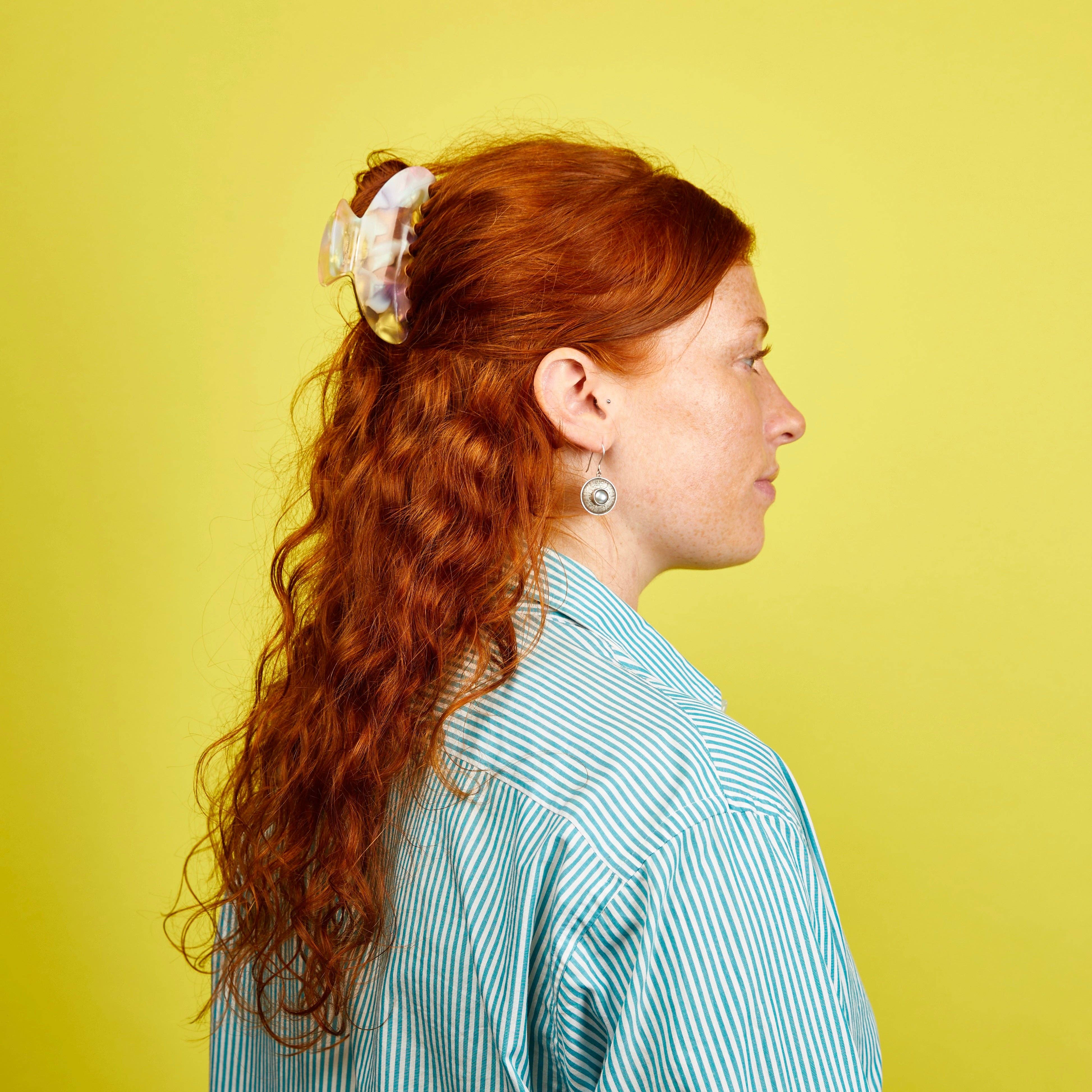 This medium sized hair claw is super versatile and works for all hair types and textures. Use for full twists or buns on fine to medium hair. Use for half updo's with medium to thick hair. Made from high quality acetate; a durable, plant based bio-plastic. Metal hardware is lead and nickel-free. Slight variations will appear with pattern, color and form due to the handmade nature of the product. Measures approx 4"L x 2"H x 2"D