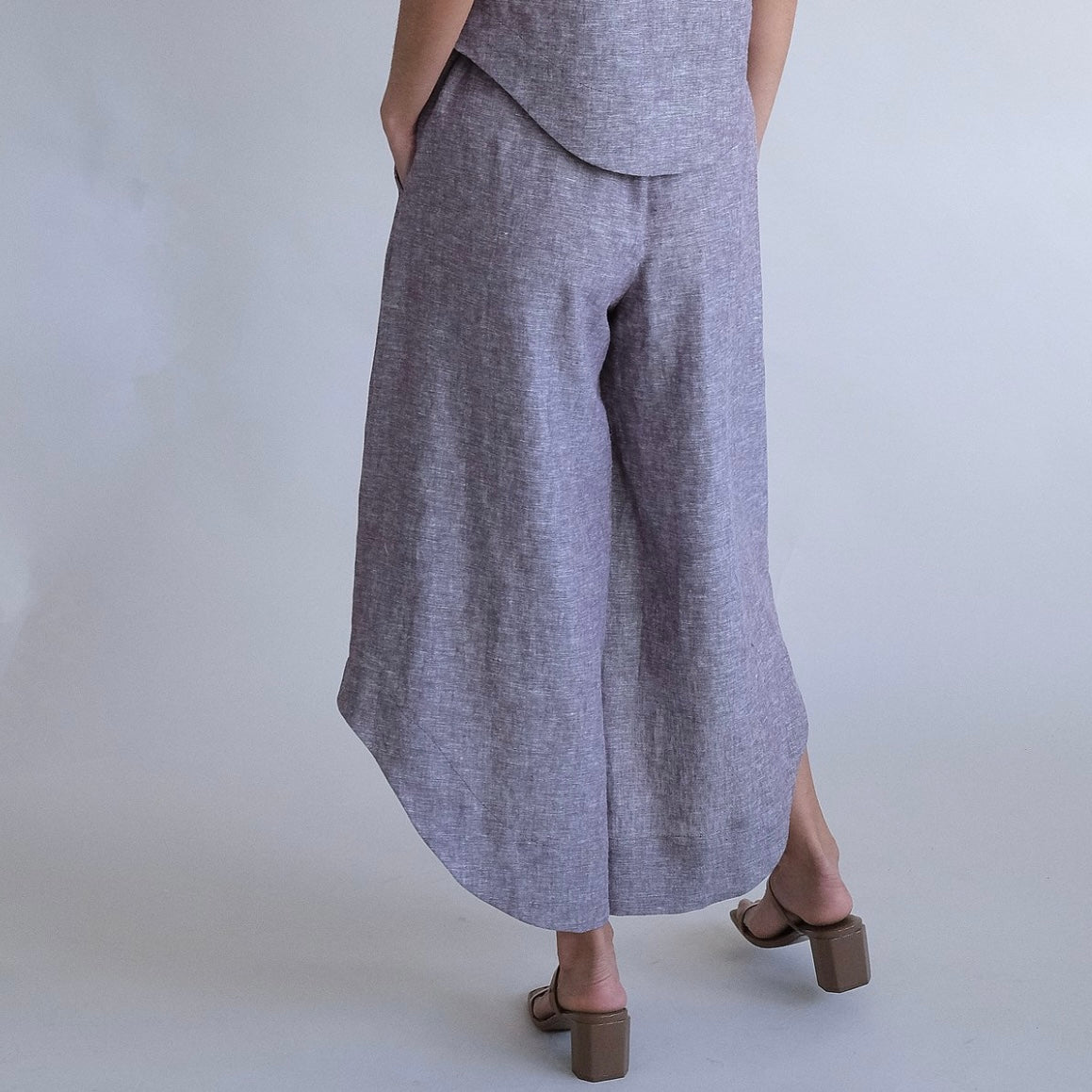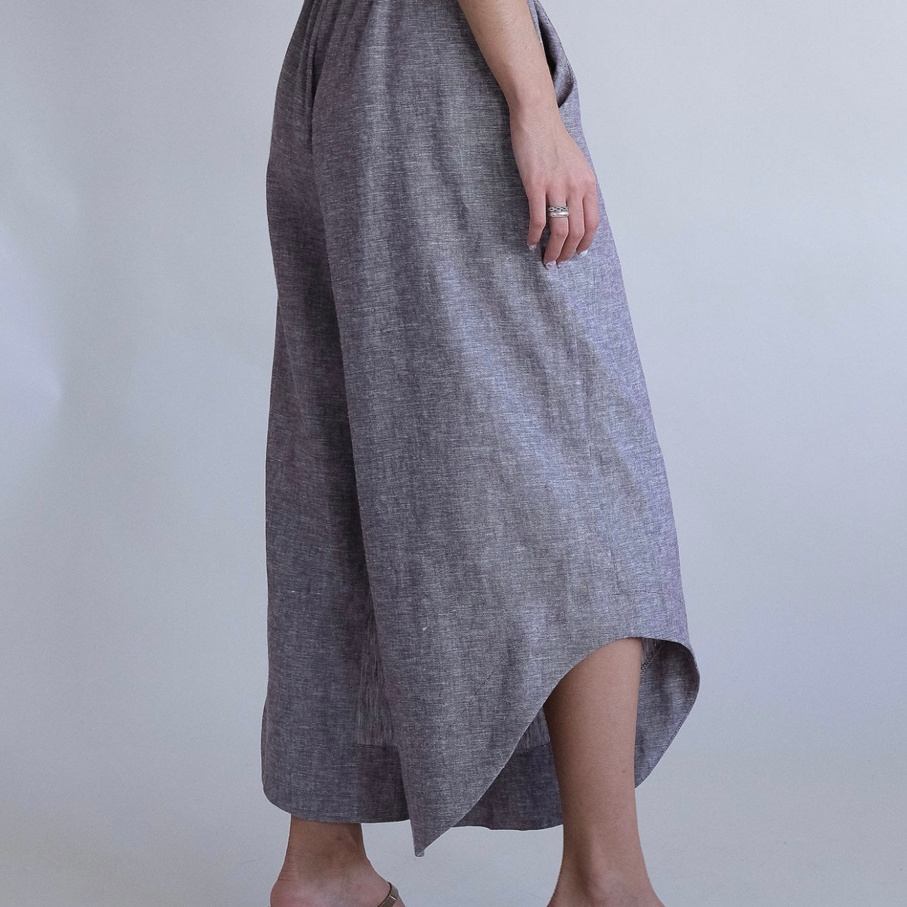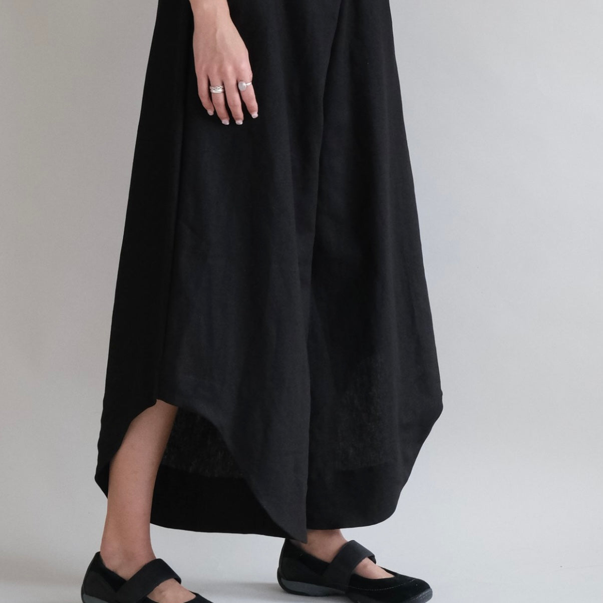 Rumi designed this pant as our answer to a full trouser. no fussing with a zipper though as these pull on and feature a clever fold-over front fly. generous front side pockets, signature curve hem with wide facing detail. pair with one of our matching tops for an effortless-but-pulled-together look.