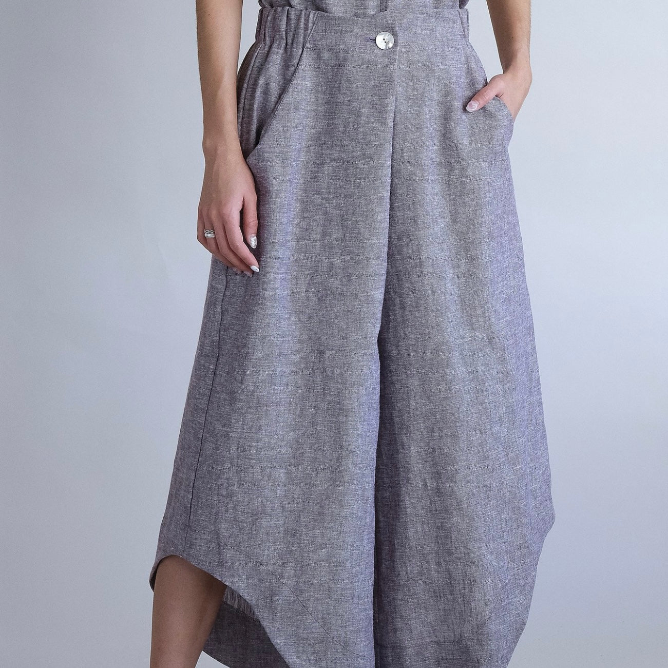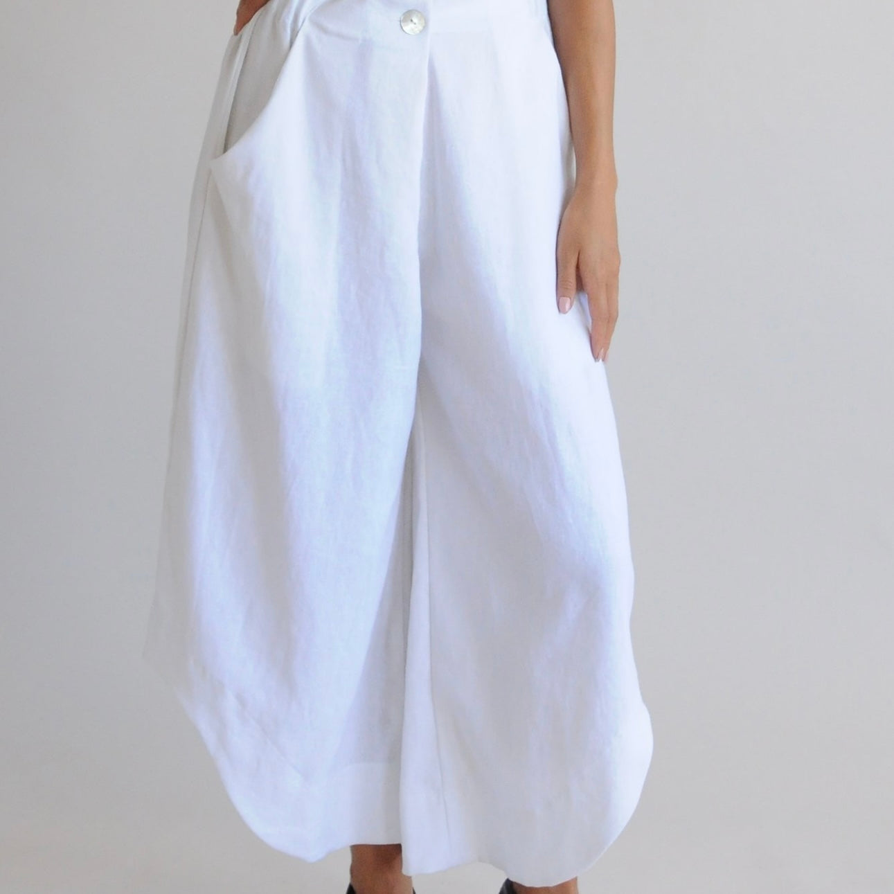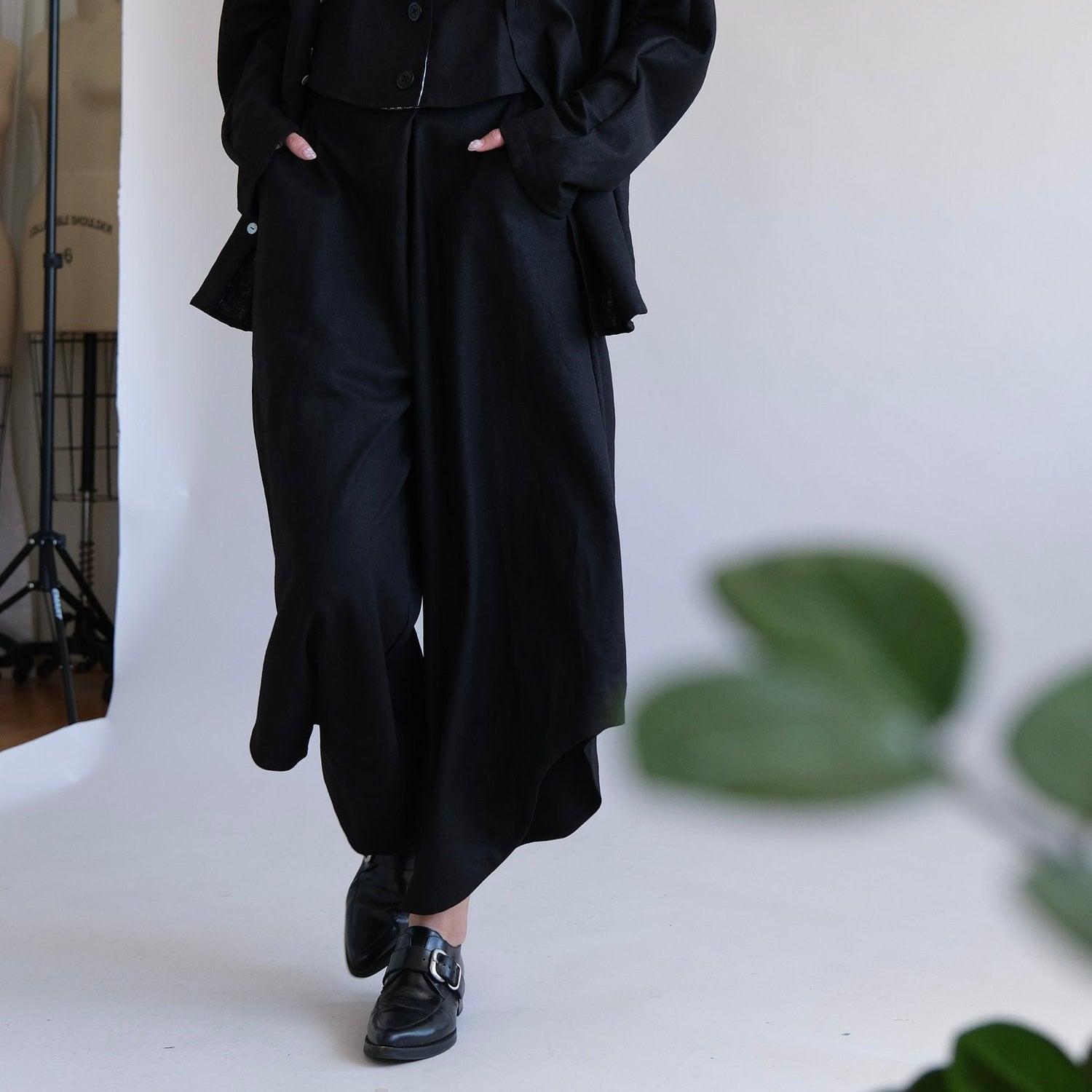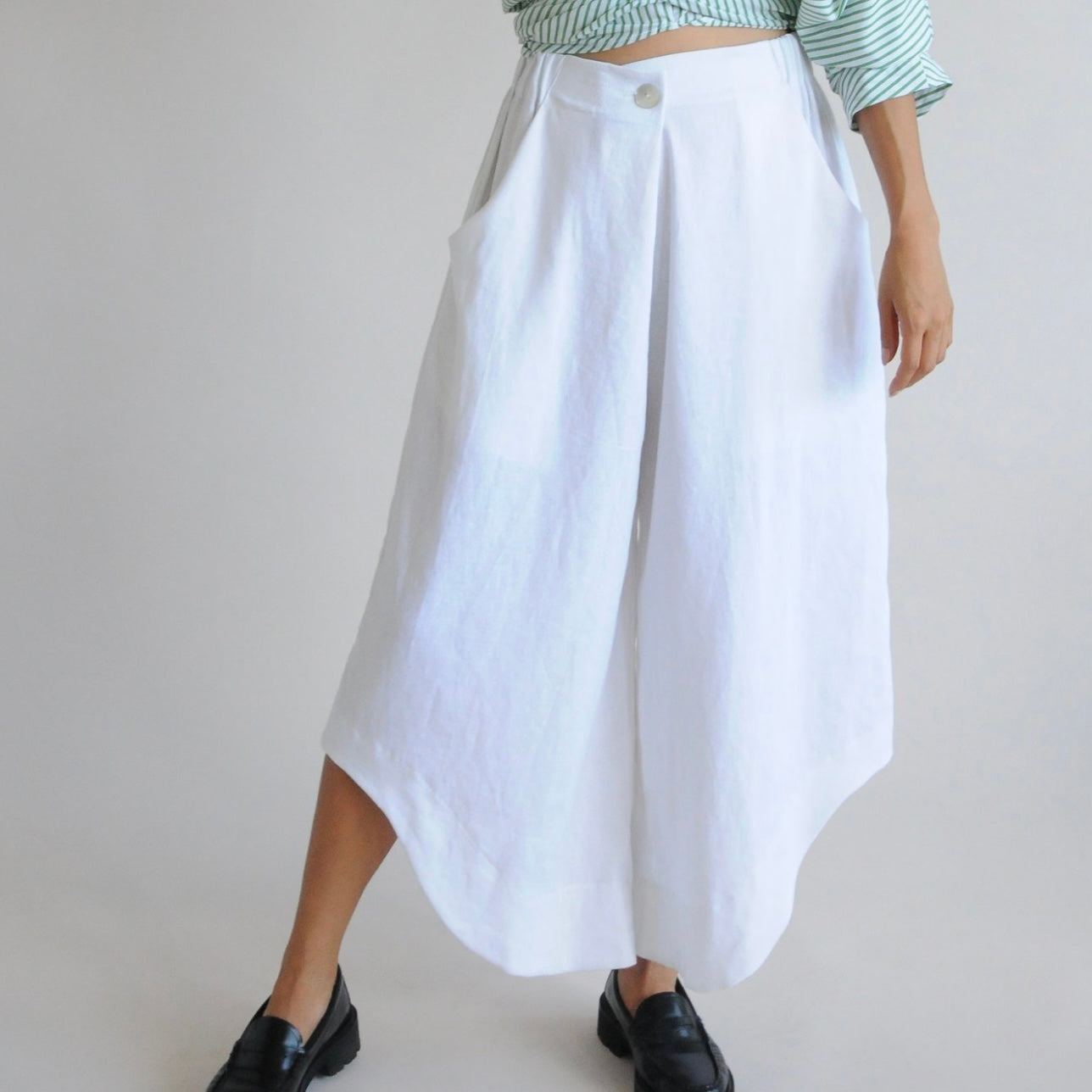 Rumi designed this pant as our answer to a full trouser. no fussing with a zipper though as these pull on and feature a clever fold-over front fly. generous front side pockets, signature curve hem with wide facing detail. pair with one of our matching tops for an effortless-but-pulled-together look.