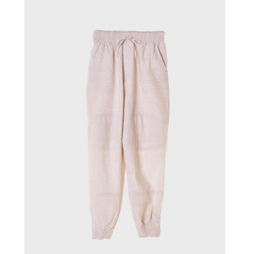 A loose-fitting pair of unisex joggers made in 40’s count handspun organic cotton. Handspun yarn is made using a single spindle Gandhi charkha. Meticulously crafted by artisans in India.
