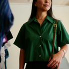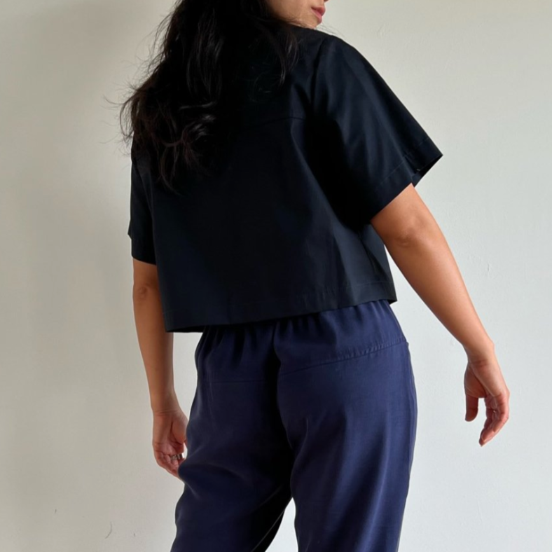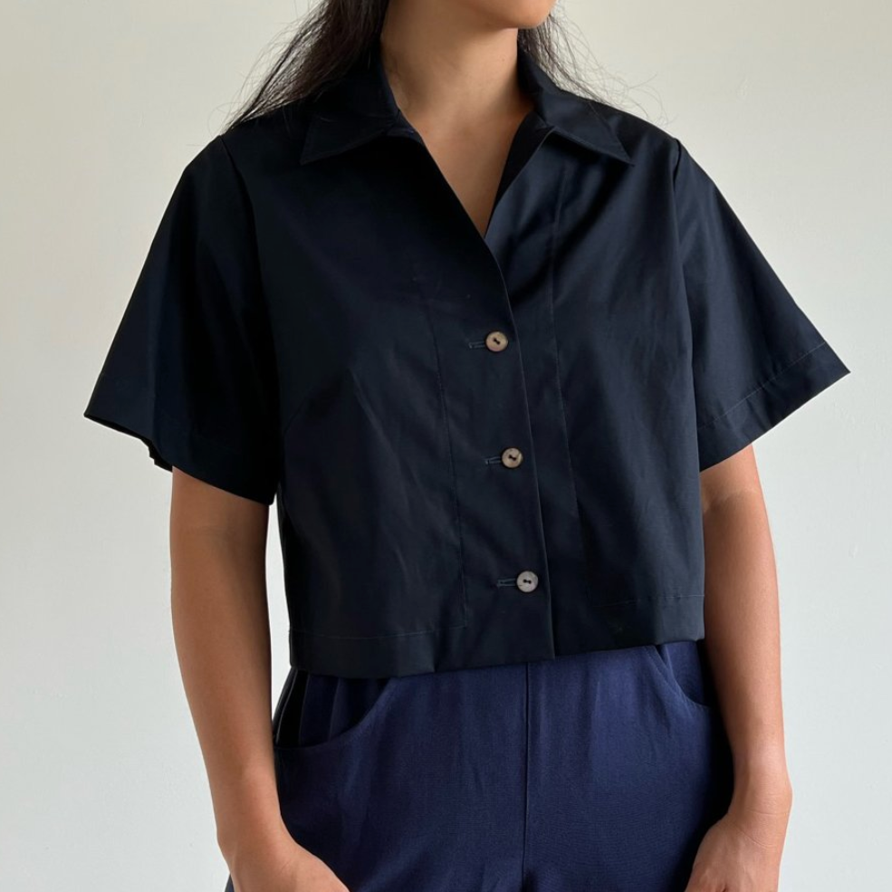 Part of RM FOUNDATION collection, the ARATI features an easy, boxy fit that works buttoned up with trousers or open as an over-shirt or extra layer over a dress. fitted across the shoulder, bust darts, short sleeved, generous armhole, button front, 1” wide sleeve and bottom hems, wide back yoke seam detail.