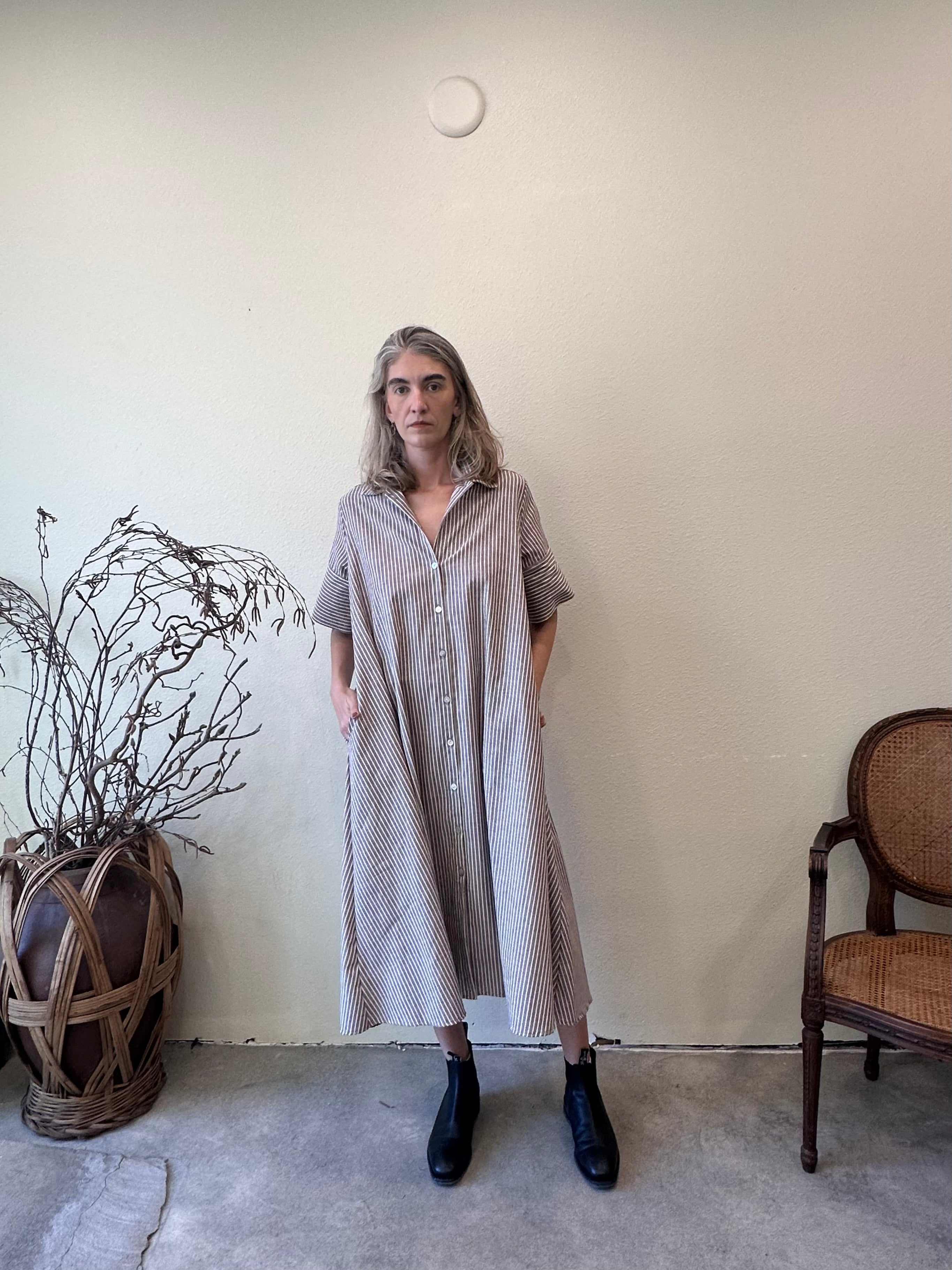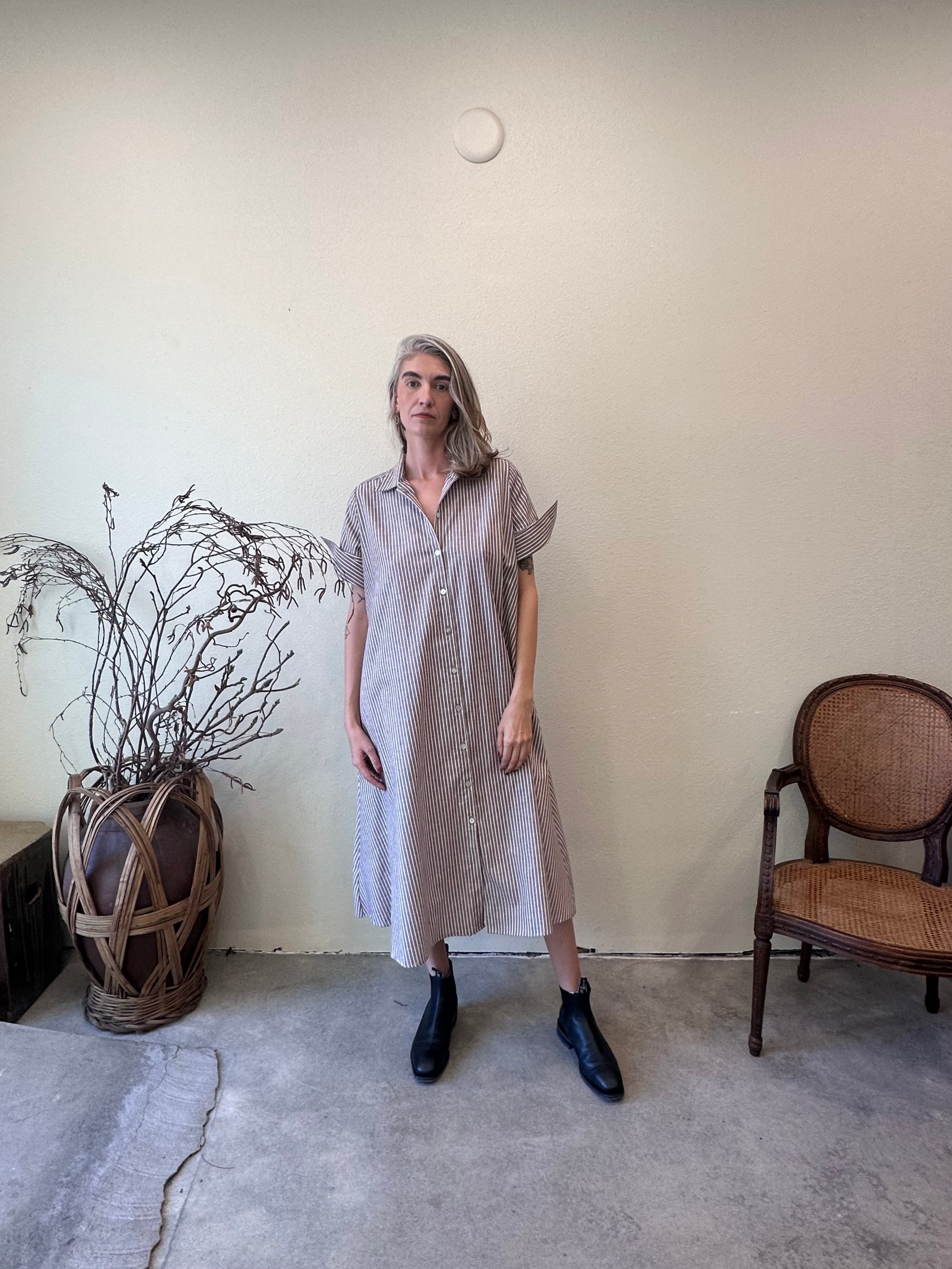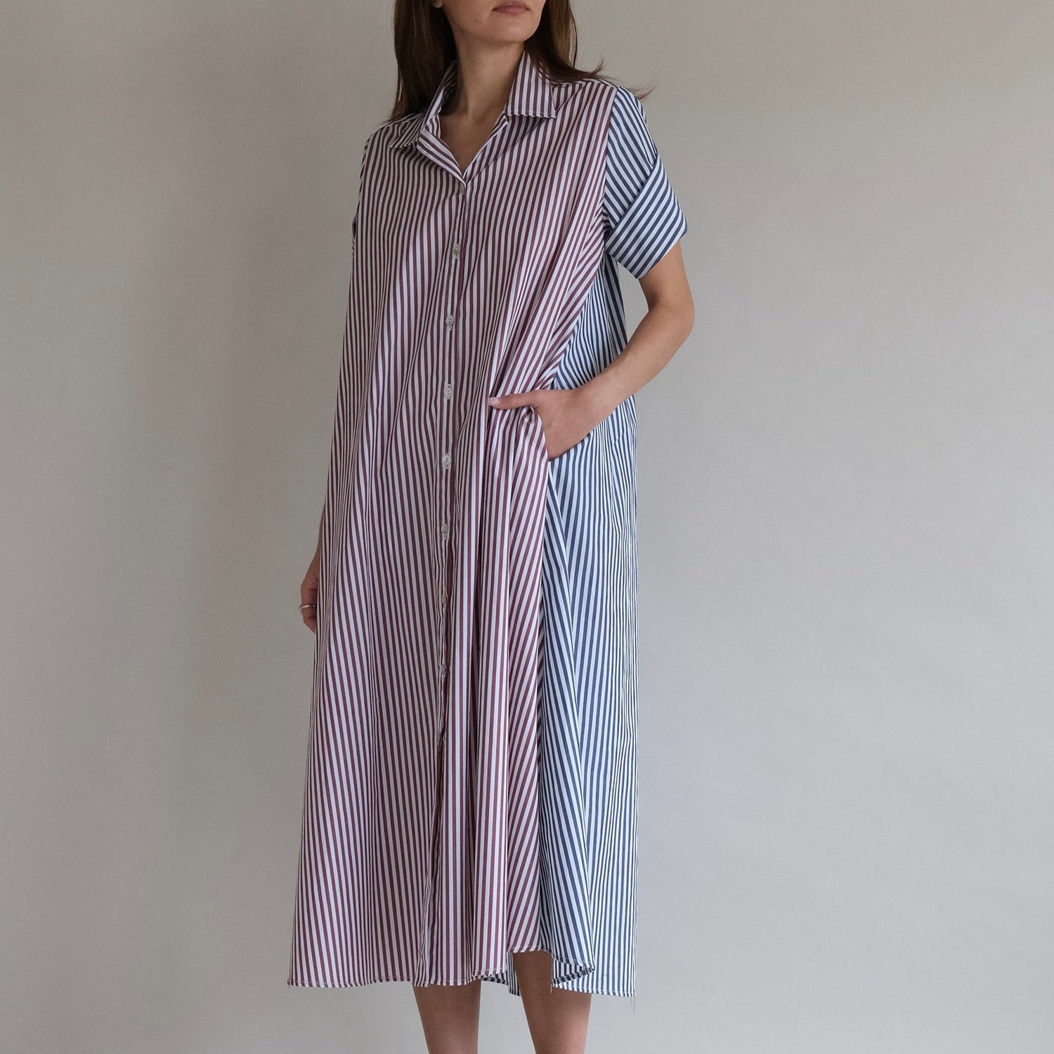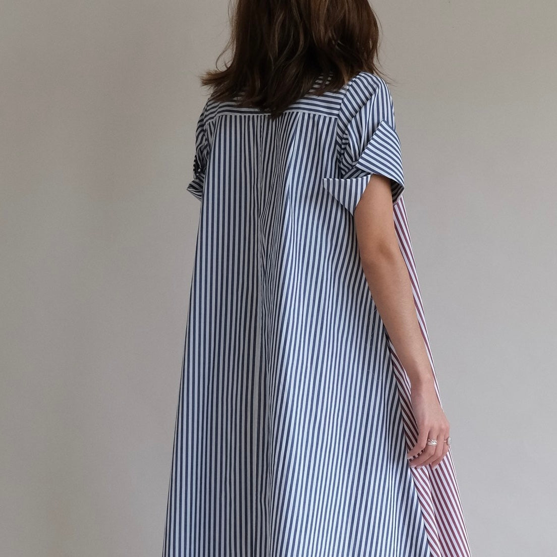 Part of RM FOUNDATION collection, the EMIKO dress quickly became a hero piece in everyone’s wardrobe. the hero is a clothing item that you don’t already own in another color/fabric that immediately upgrades everything else in your closet. cut in a silky 100% cotton japan woven chambray stripe, fitted through the shoulders and armhole, short sleeve with extended cuff detail, button front, in-seam side pockets, rolled hem. it’s a dress that doubles as an over-shirt, think trench coat.