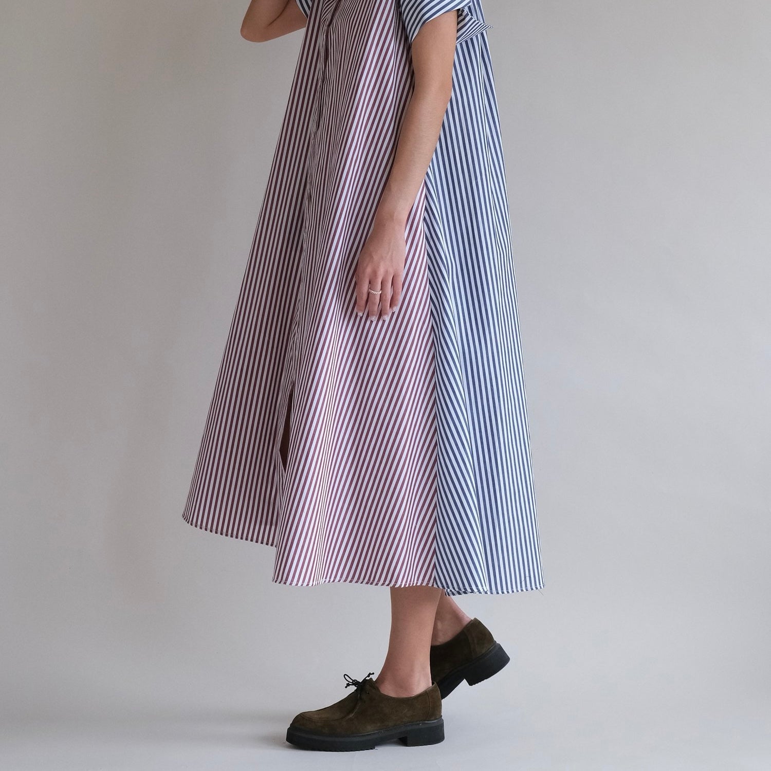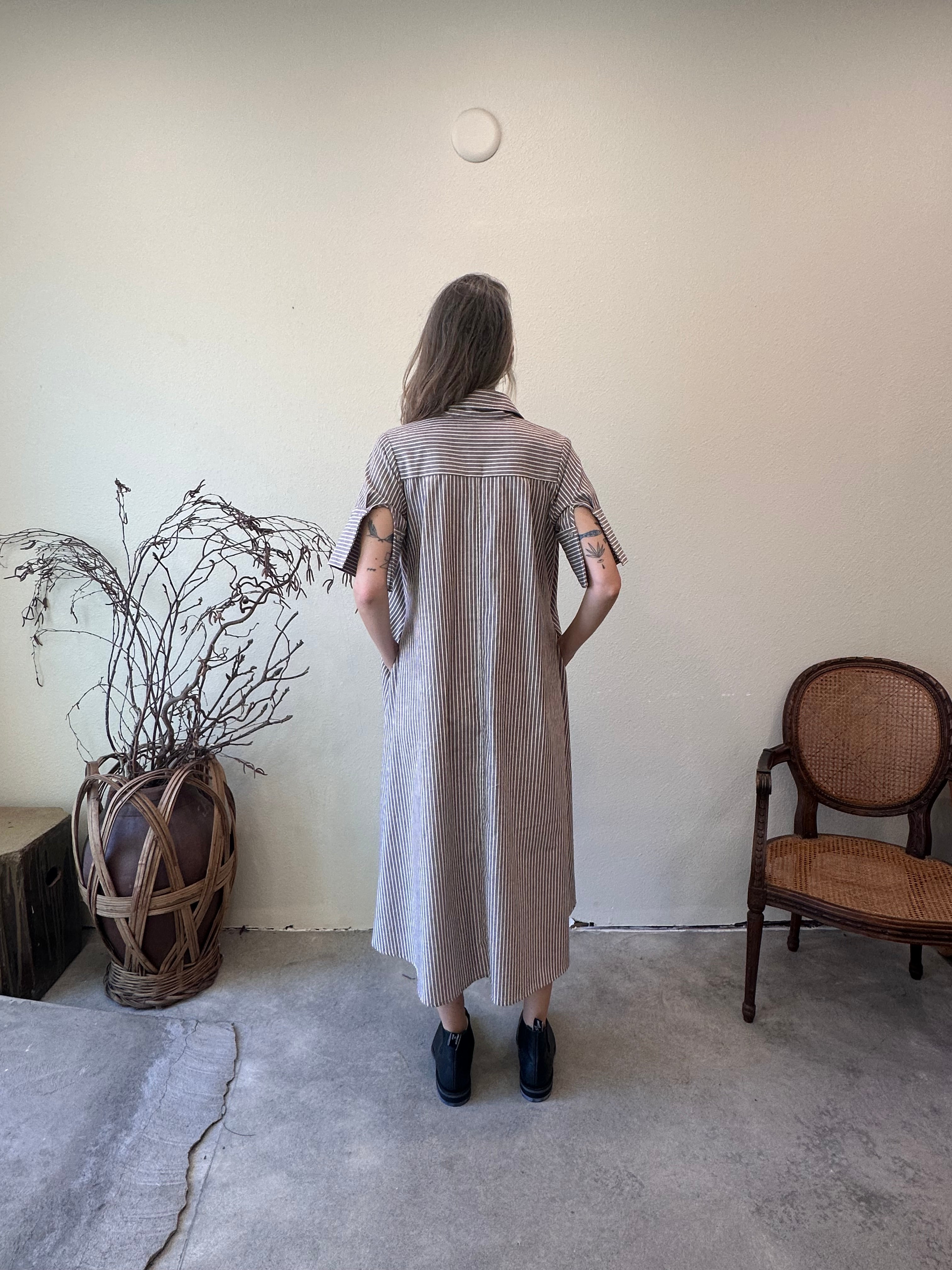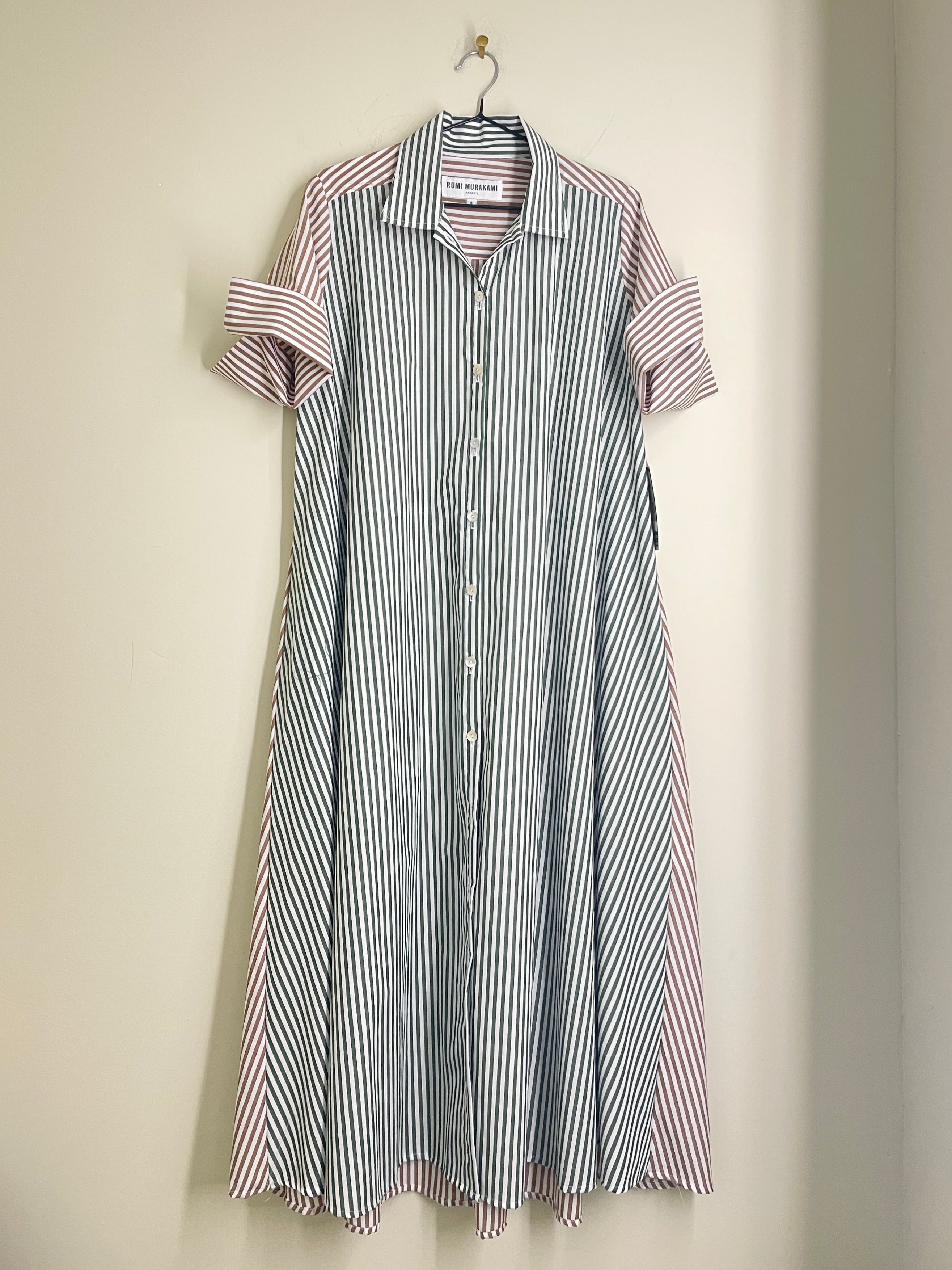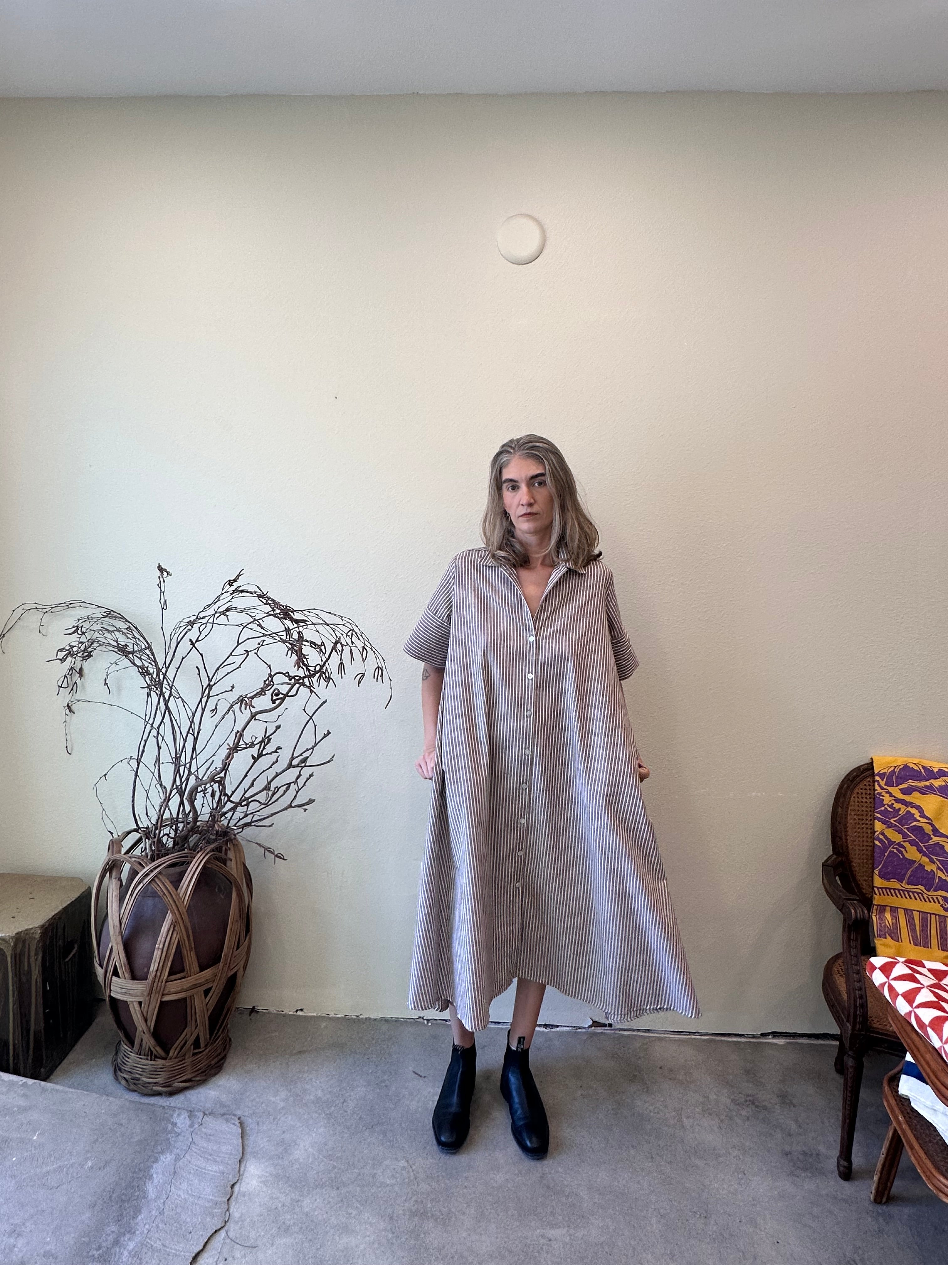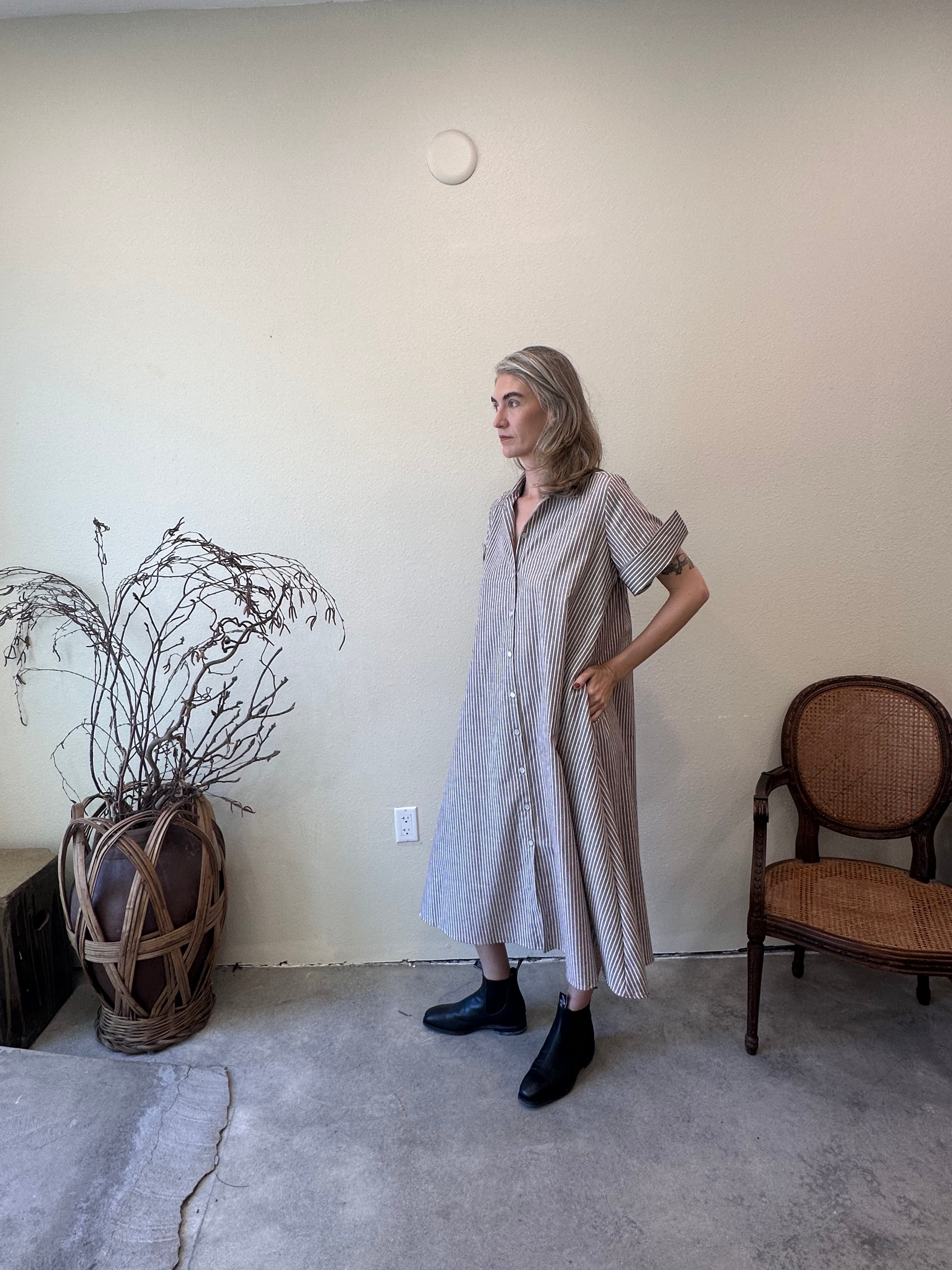 Part of RM FOUNDATION collection, the EMIKO dress quickly became a hero piece in everyone’s wardrobe. the hero is a clothing item that you don’t already own in another color/fabric that immediately upgrades everything else in your closet. cut in a silky 100% cotton japan woven chambray stripe, fitted through the shoulders and armhole, short sleeve with extended cuff detail, button front, in-seam side pockets, rolled hem. it’s a dress that doubles as an over-shirt, think trench coat.