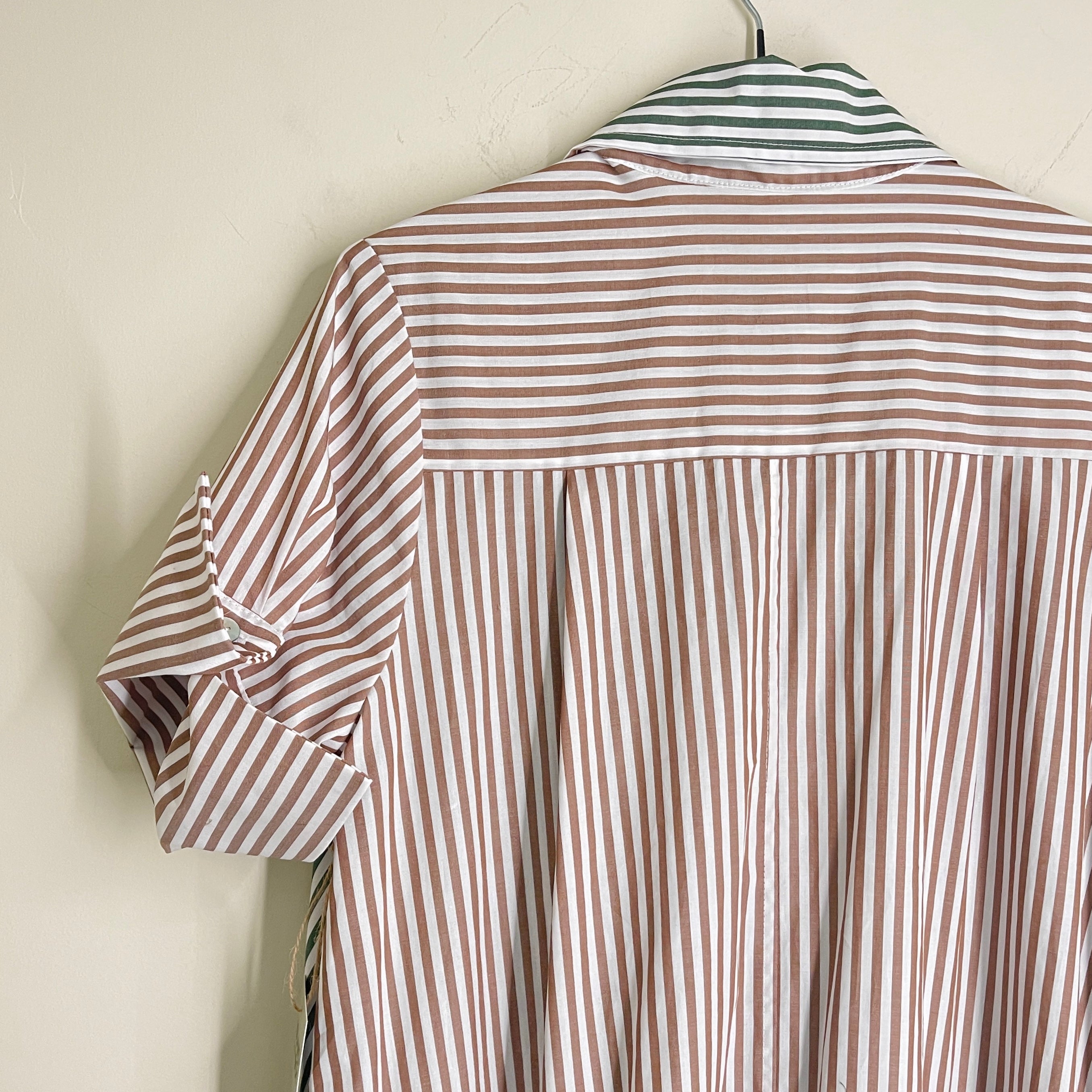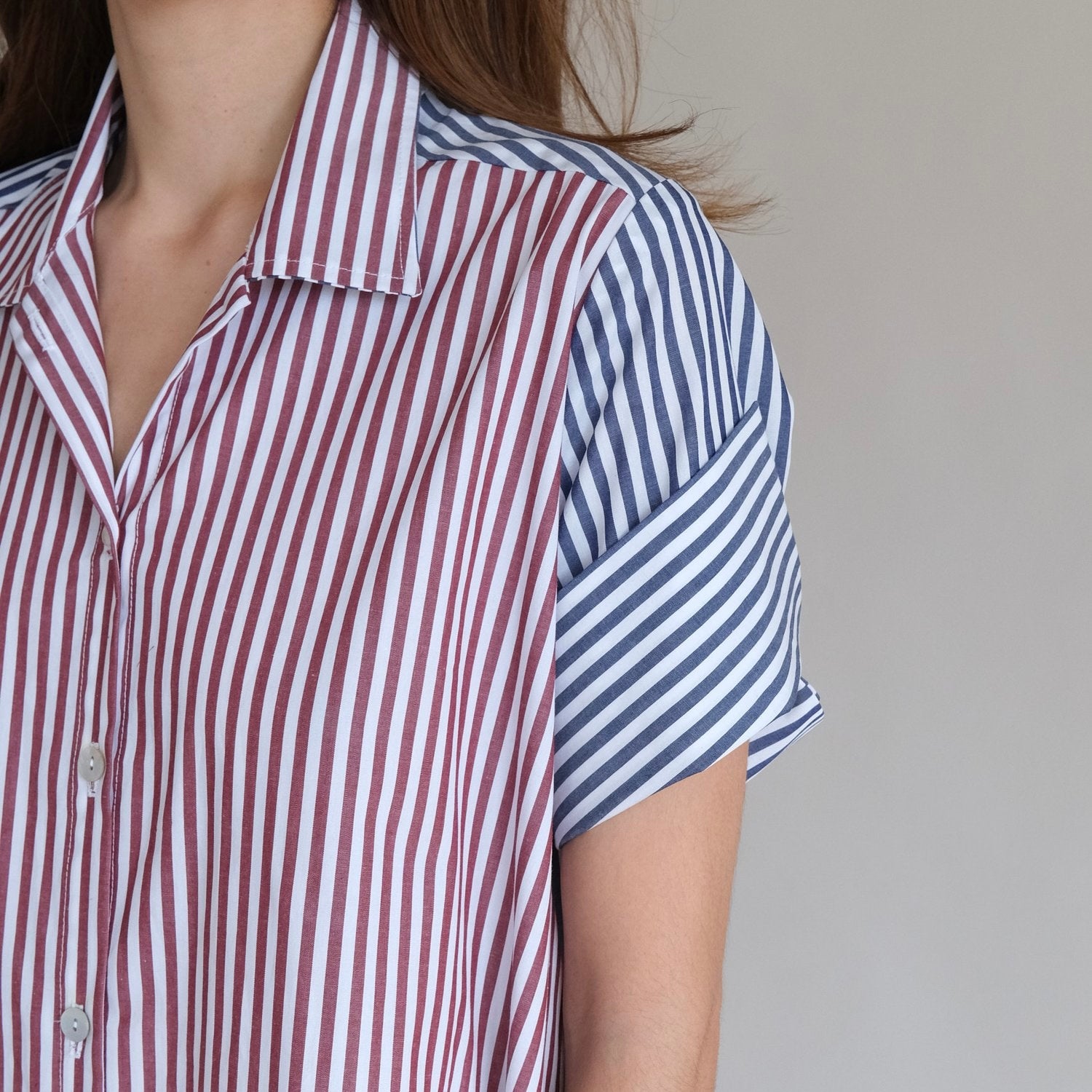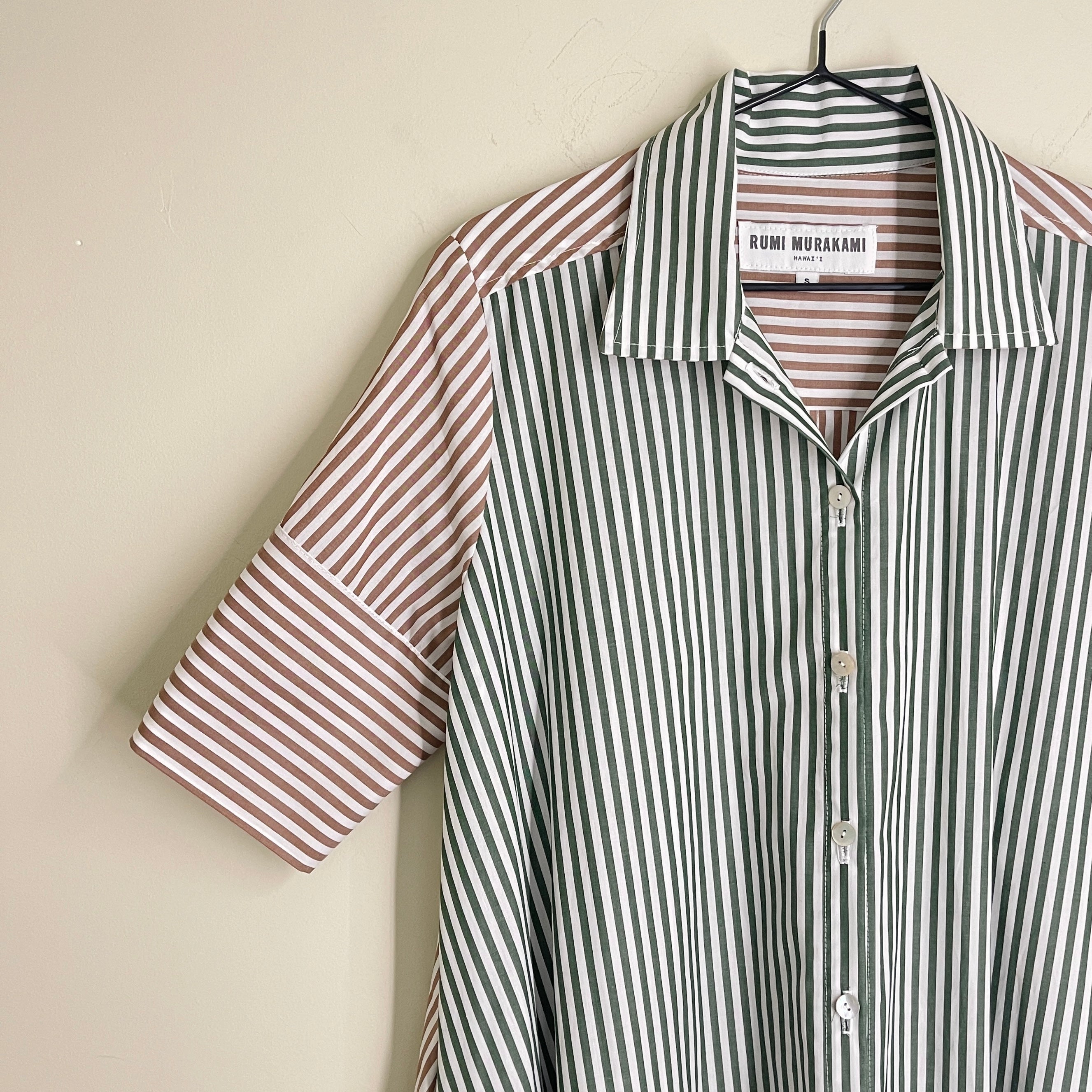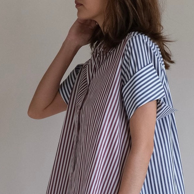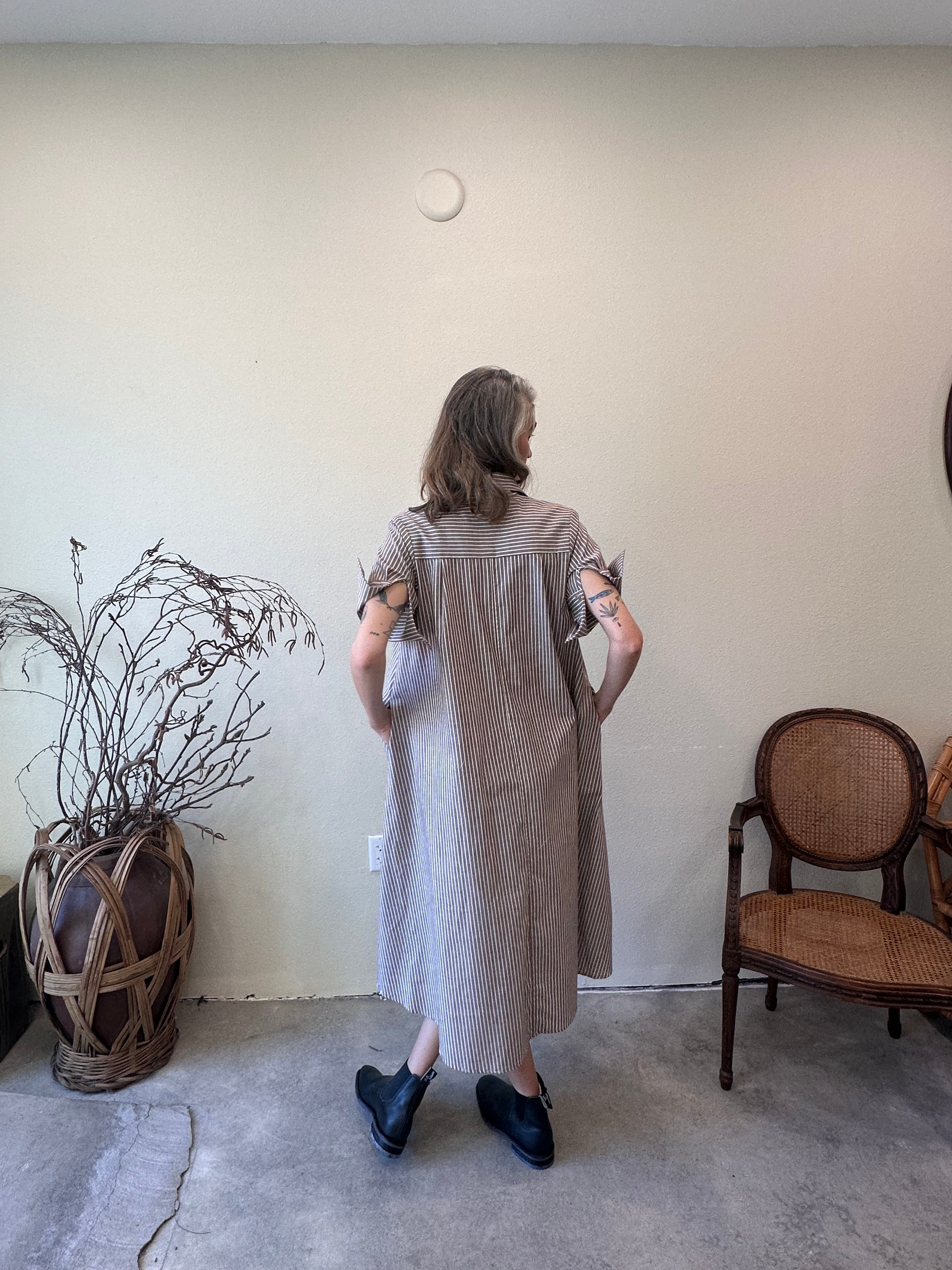Part of RM FOUNDATION collection, the EMIKO dress quickly became a hero piece in everyone’s wardrobe. the hero is a clothing item that you don’t already own in another color/fabric that immediately upgrades everything else in your closet. cut in a silky 100% cotton japan woven chambray stripe, fitted through the shoulders and armhole, short sleeve with extended cuff detail, button front, in-seam side pockets, rolled hem. it’s a dress that doubles as an over-shirt, think trench coat.