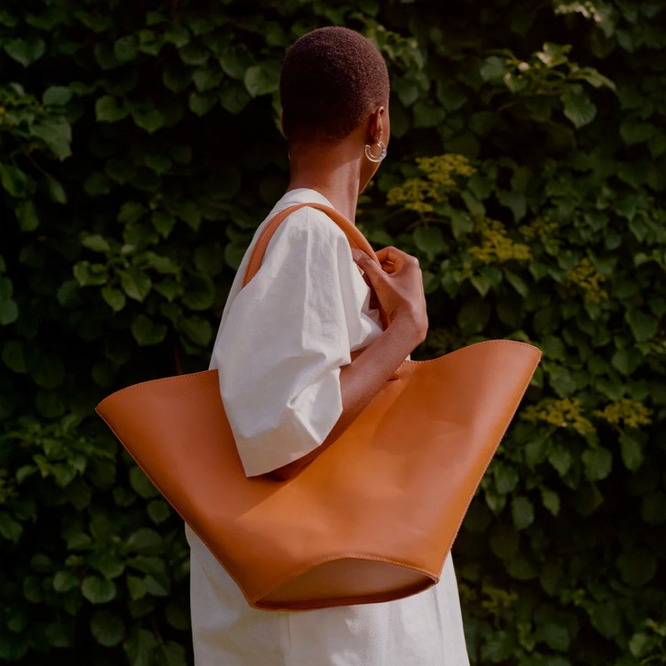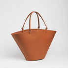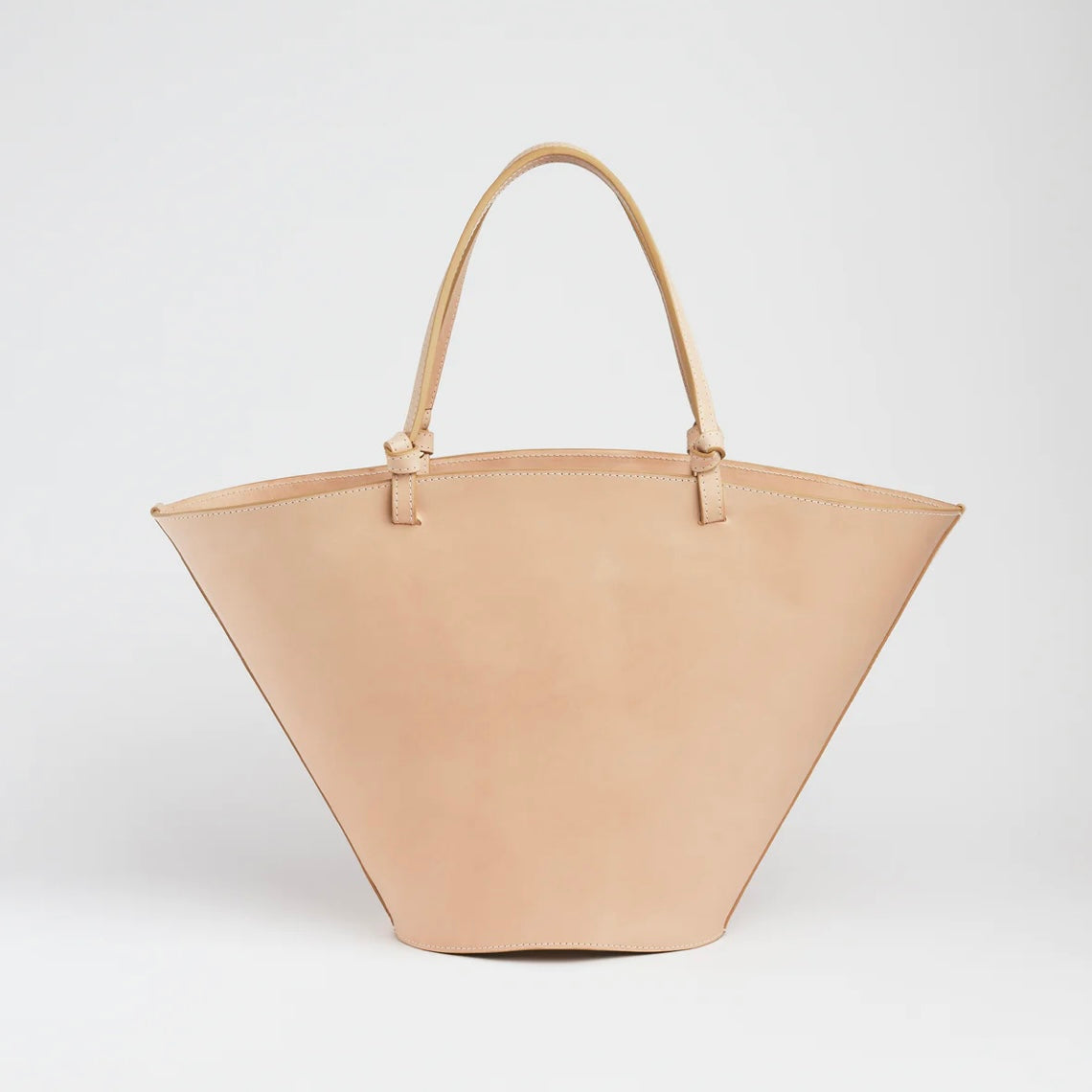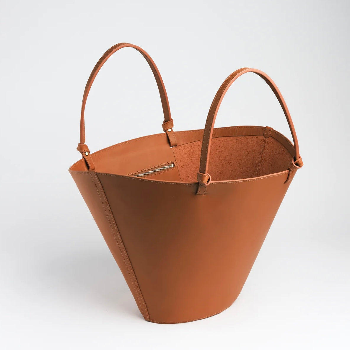 The Marka Tote rises from an elliptical base to a dramatic basket style widening at the top, and features hand knotted straps and drop pocket with zipper and card slot.