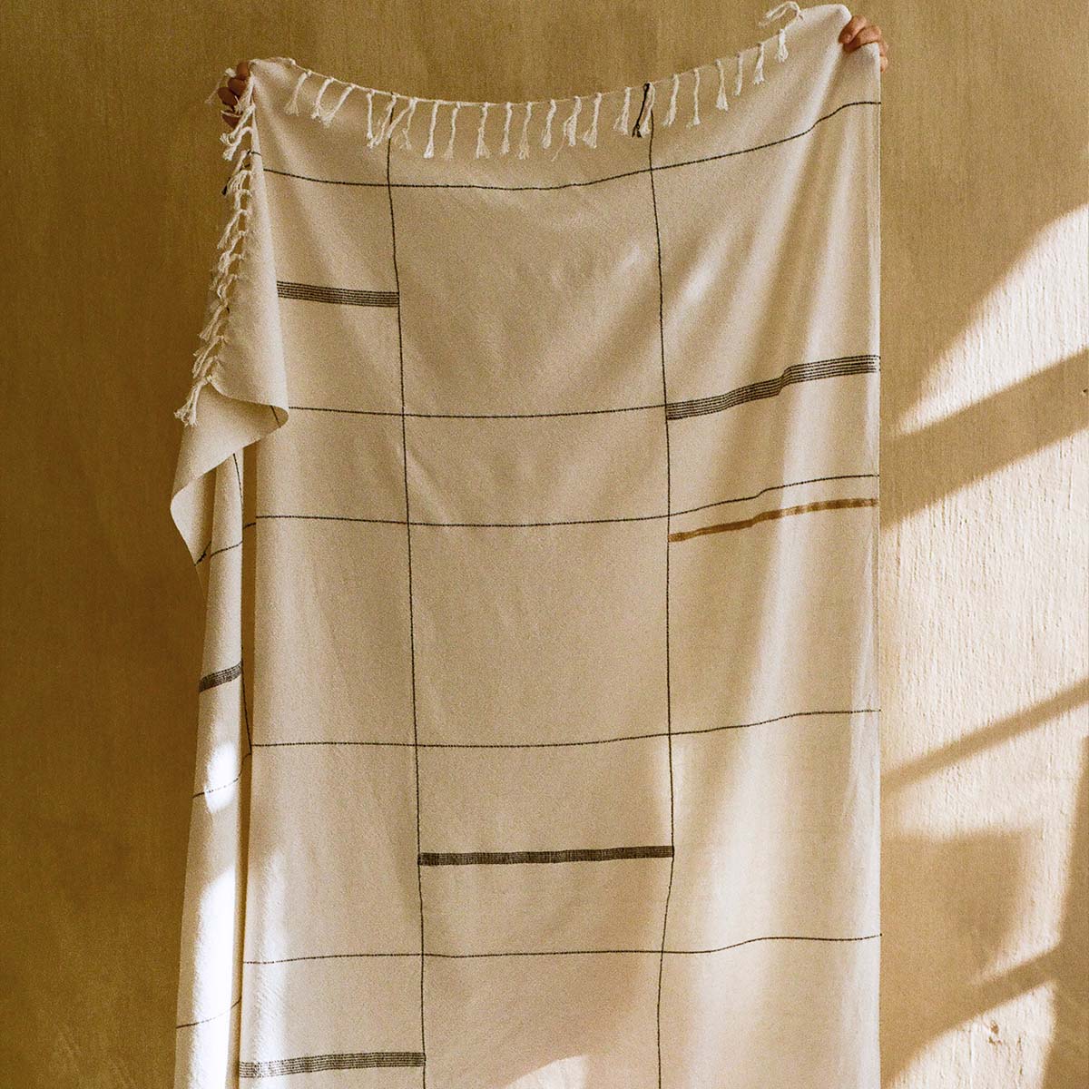 Featuring a minimal grid design with hand inlaid details which respond directly to events in the hand craft process of weaving, each throw is subtly unique and inimitably handcrafted.