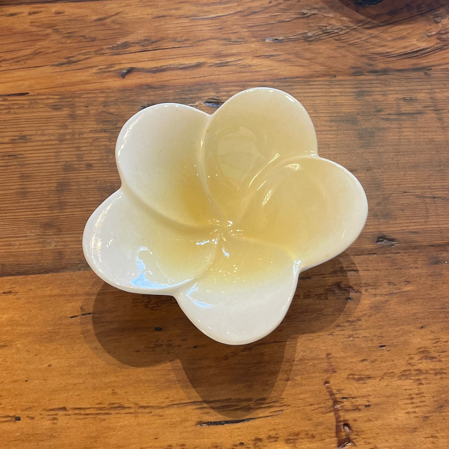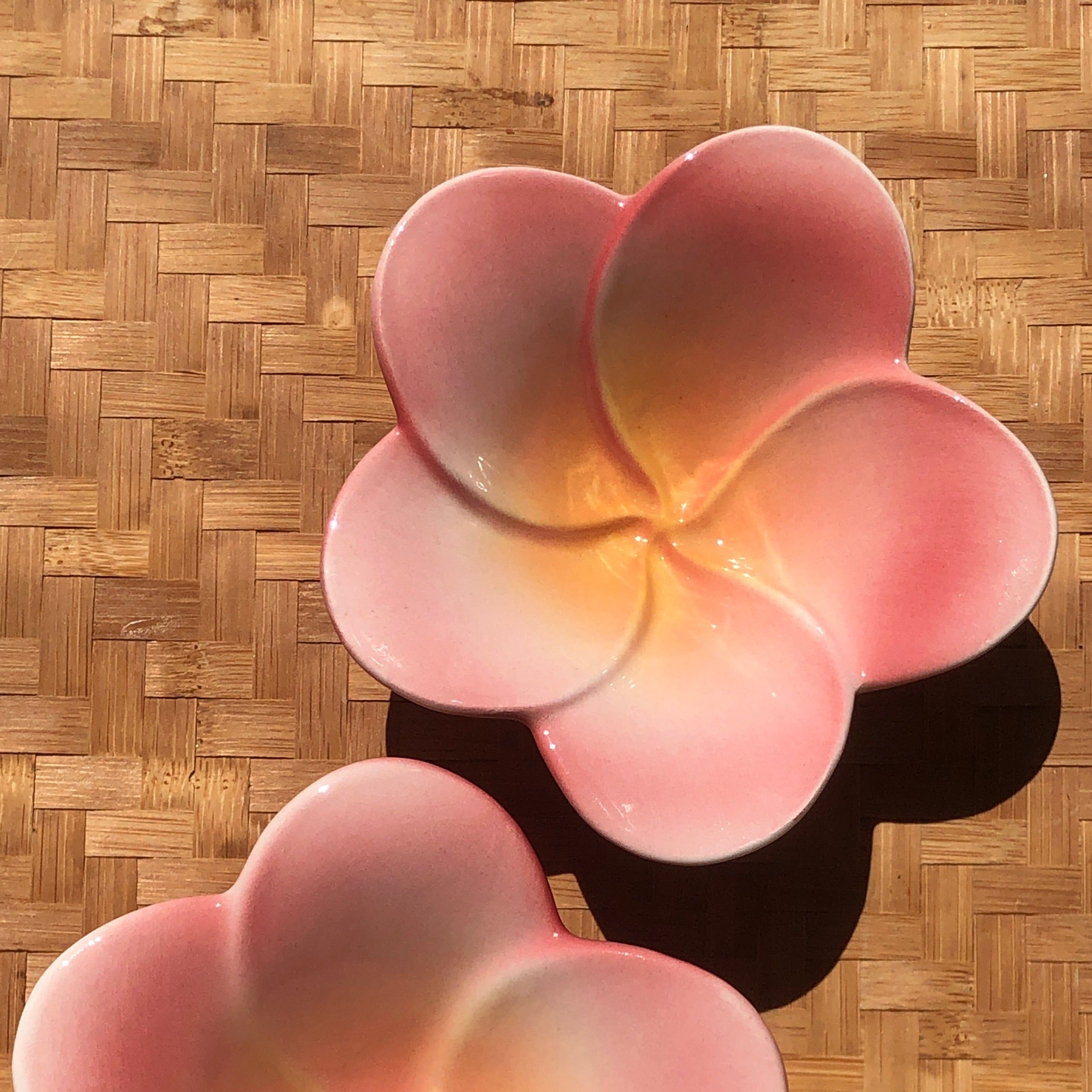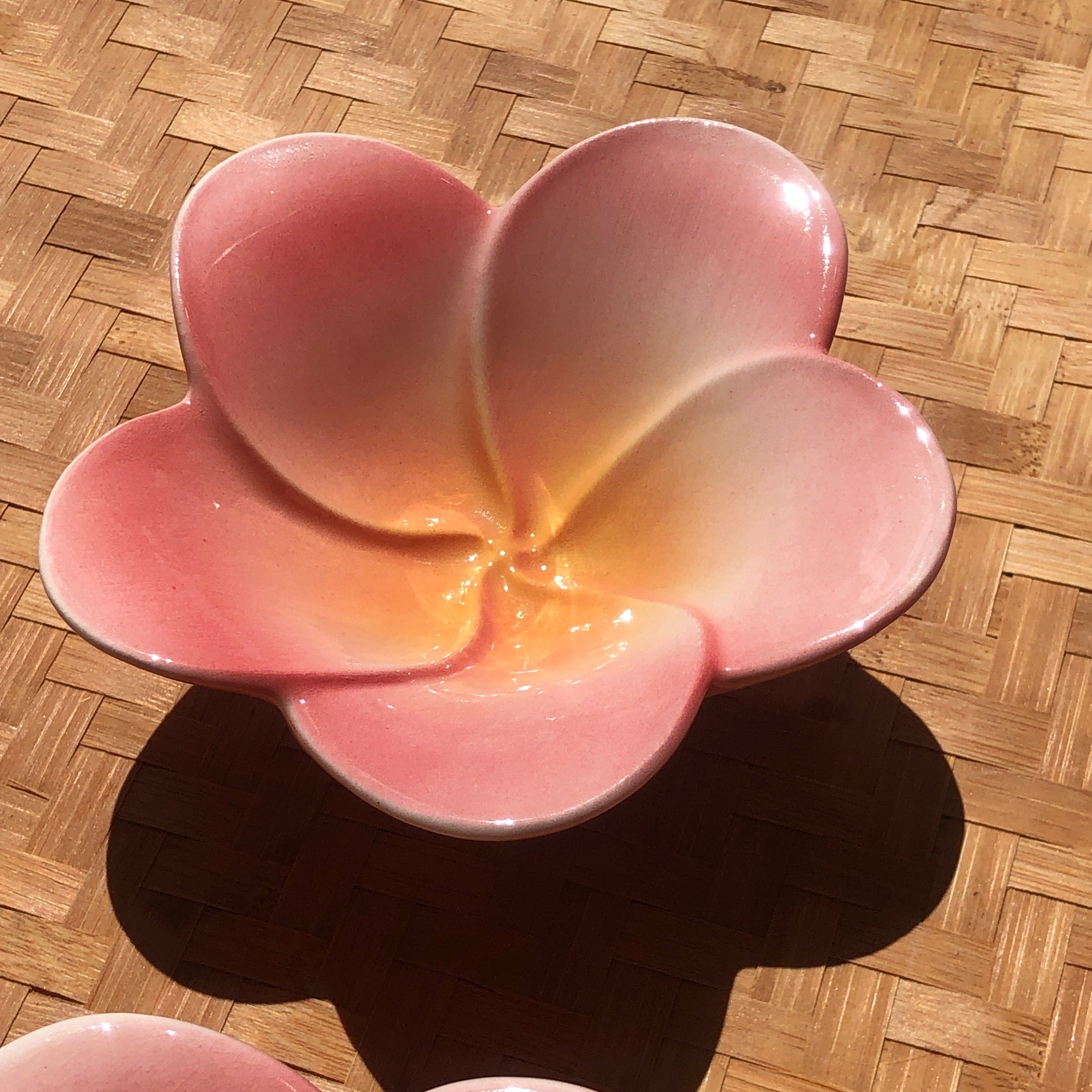 Flower Catch-all dish in the style of Mid-Century Tiki. These are slipcast and glazed in Kailua, Oahu. No two are alike, and it is tough to find a “pair” that match. These are sold individually and randomly selected "dealer's choice" colors. You can make your color request using the dropdown menu. If the color you want is not available, I will substitute the next most similar color.