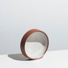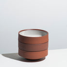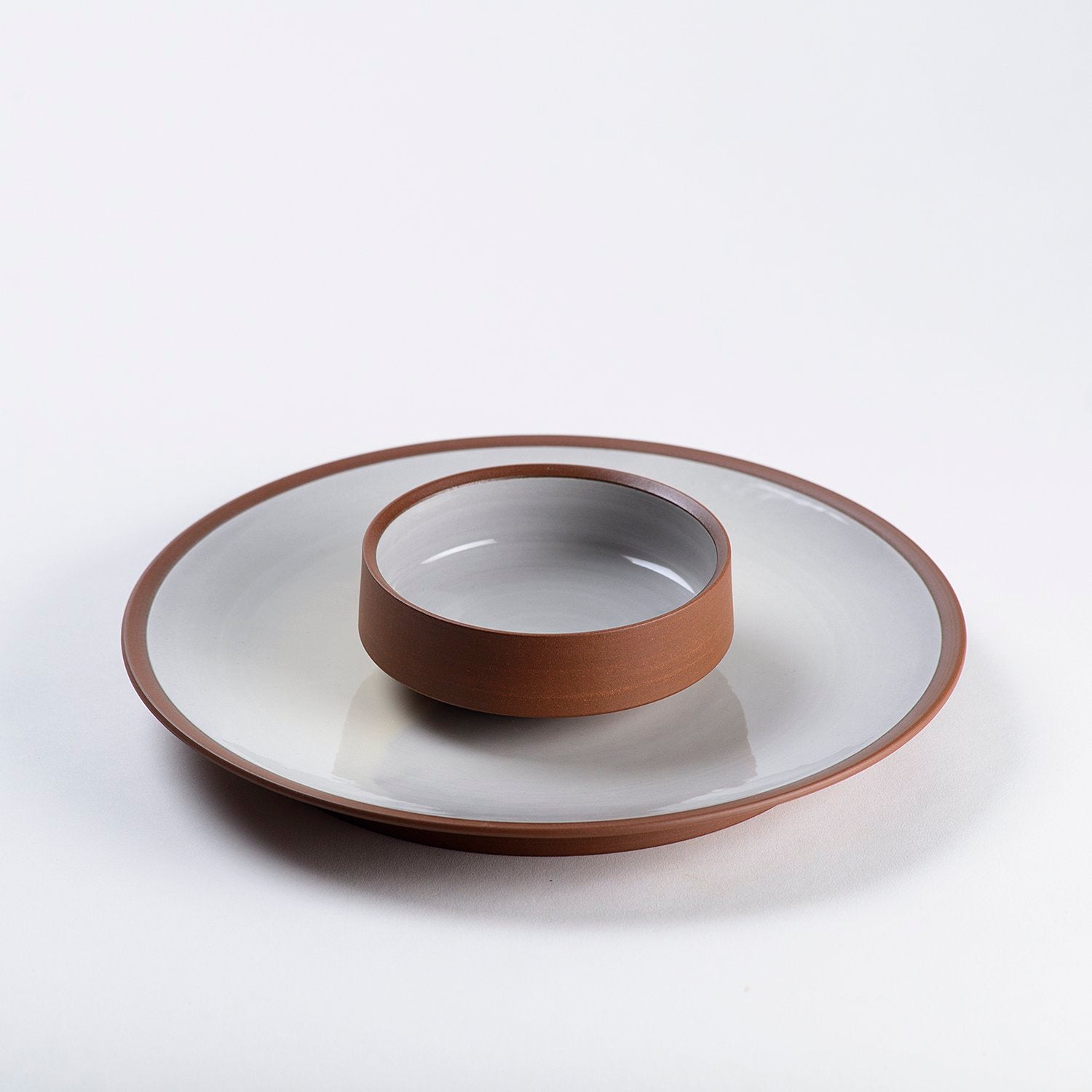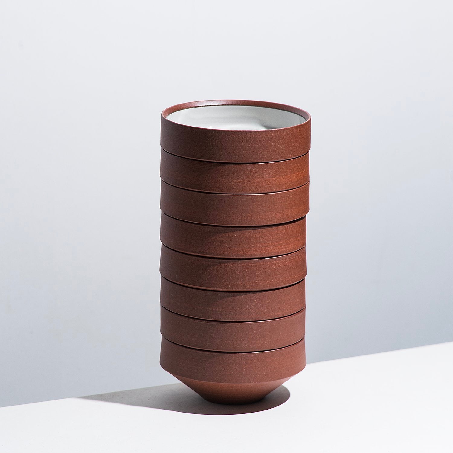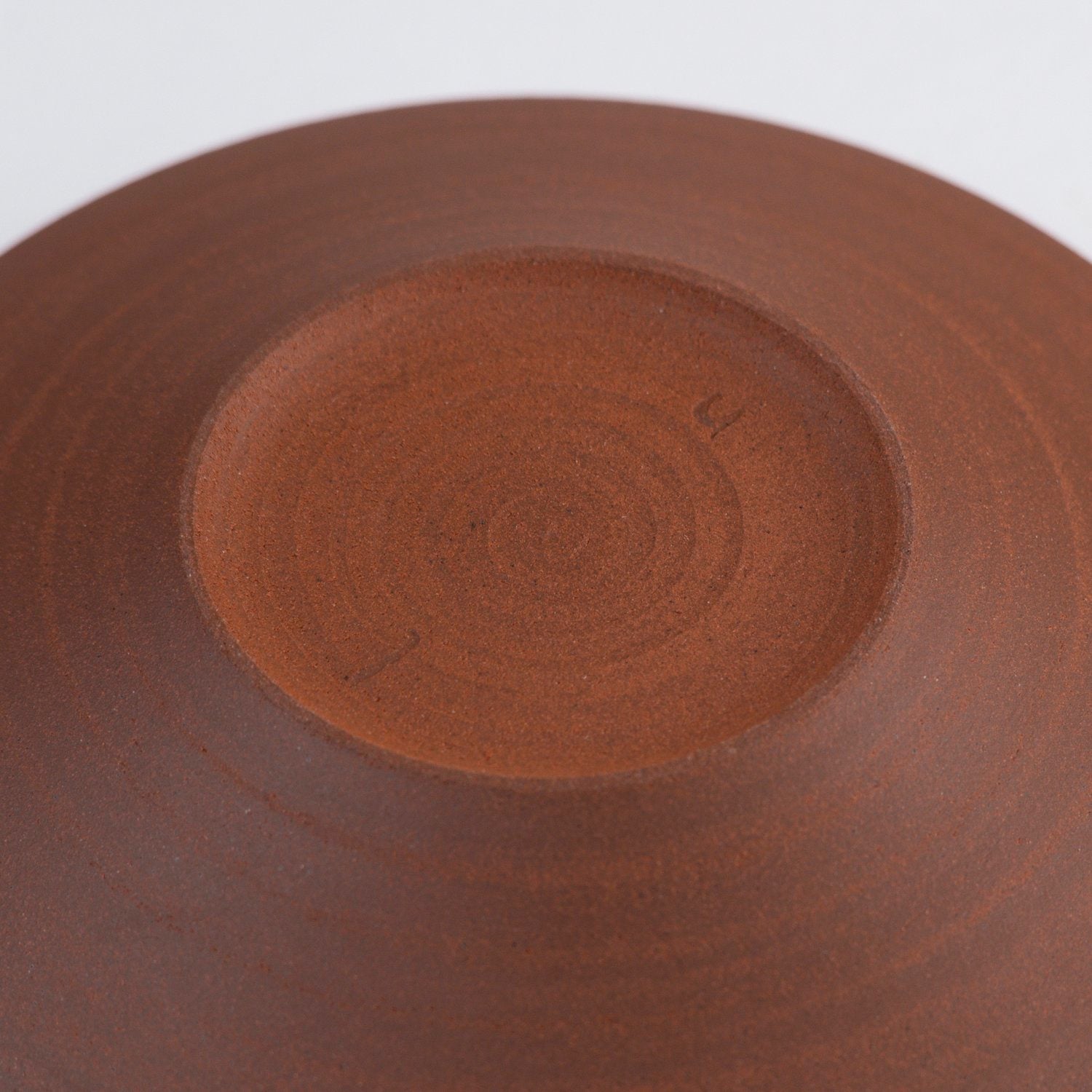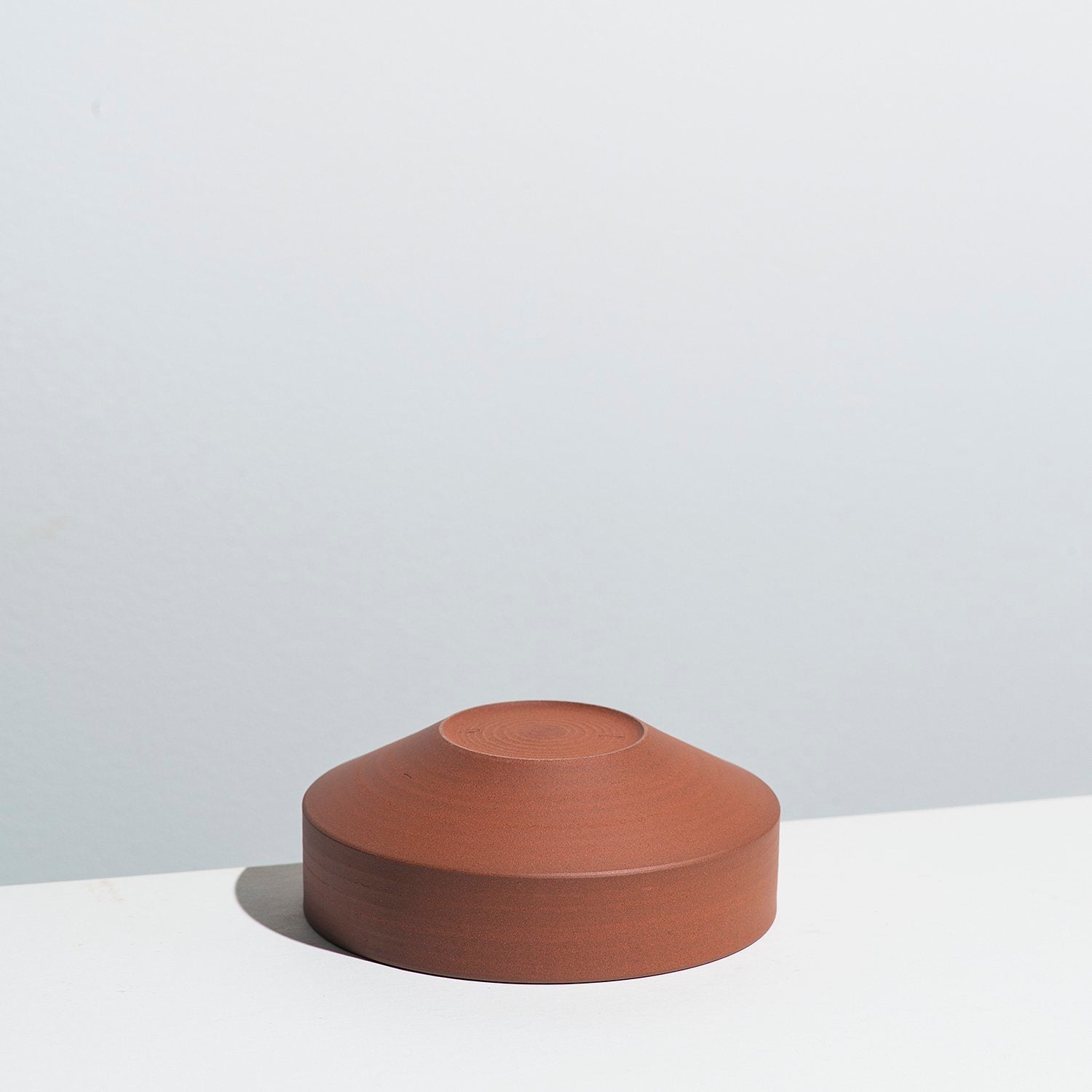 Small ramekin with beveled foot. Wheel thrown in red stoneware, exterior burnished, interior white stoneware, glossy glaze. High-fired clay is no longer porous.