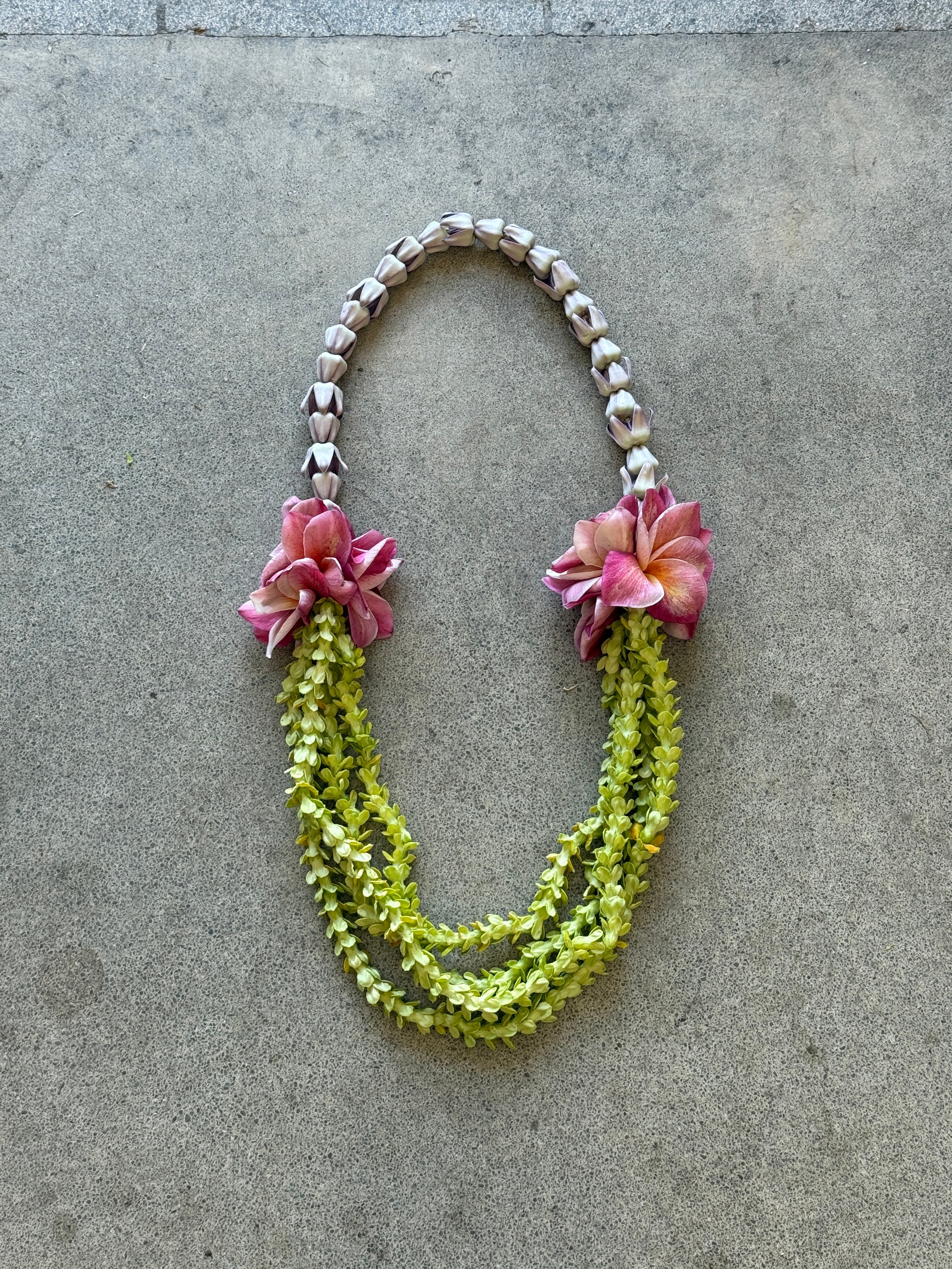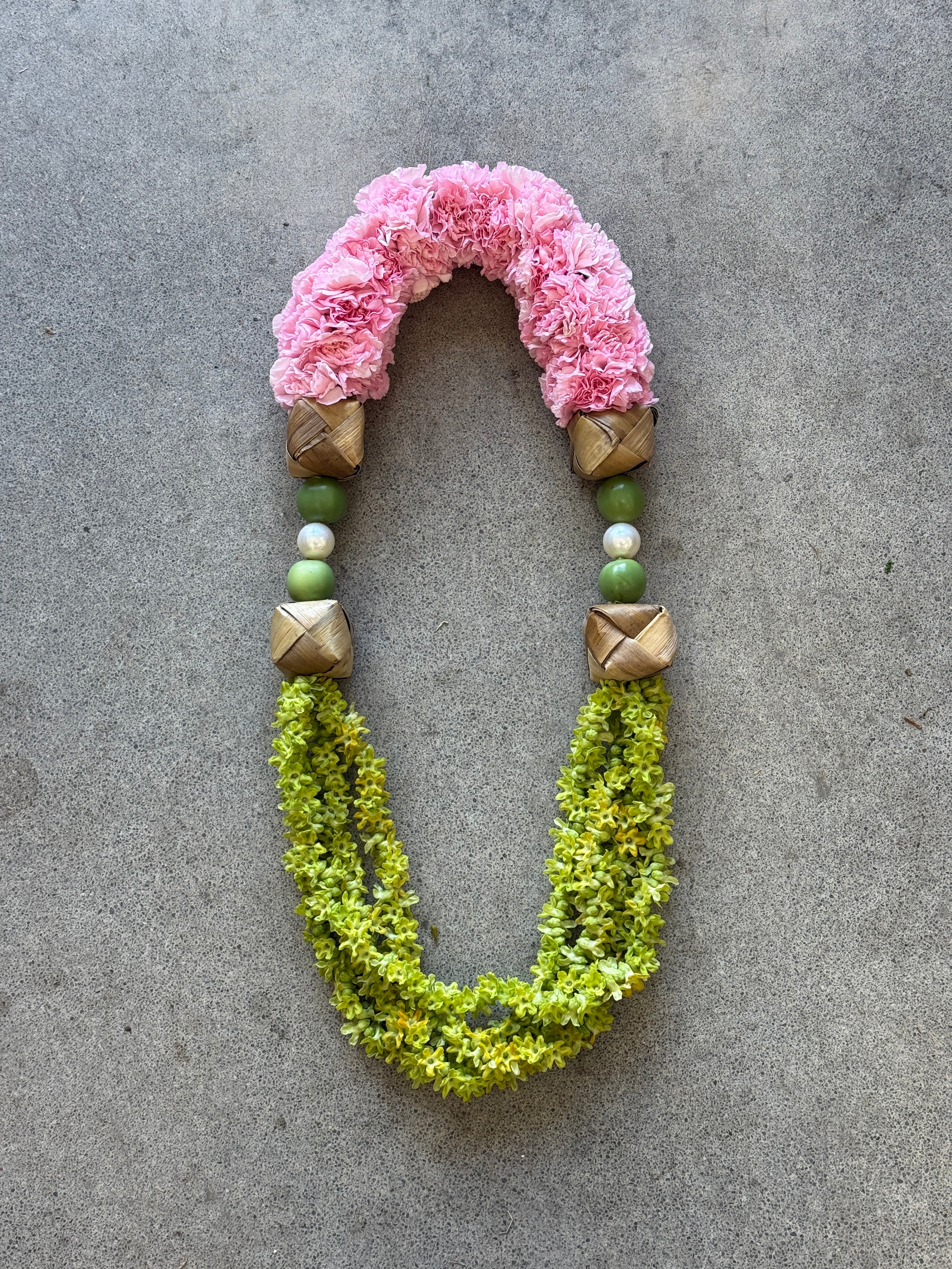 Premium Hapai/Pregnant (Open) - an open lei made with unique seasonal flowers, or a layered construction, three strands, or poepoe style construction.  Perfect if it will be a solo lei, or if a group is buying the lei together.