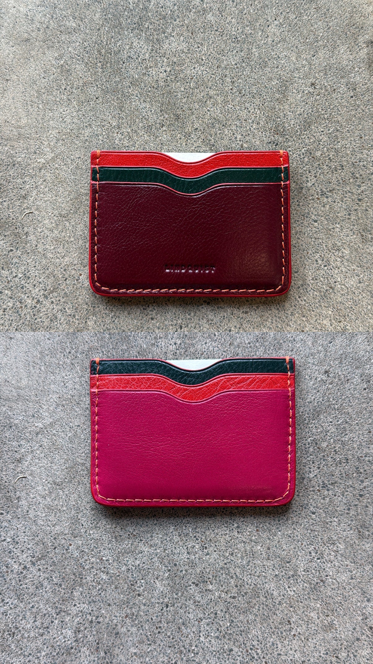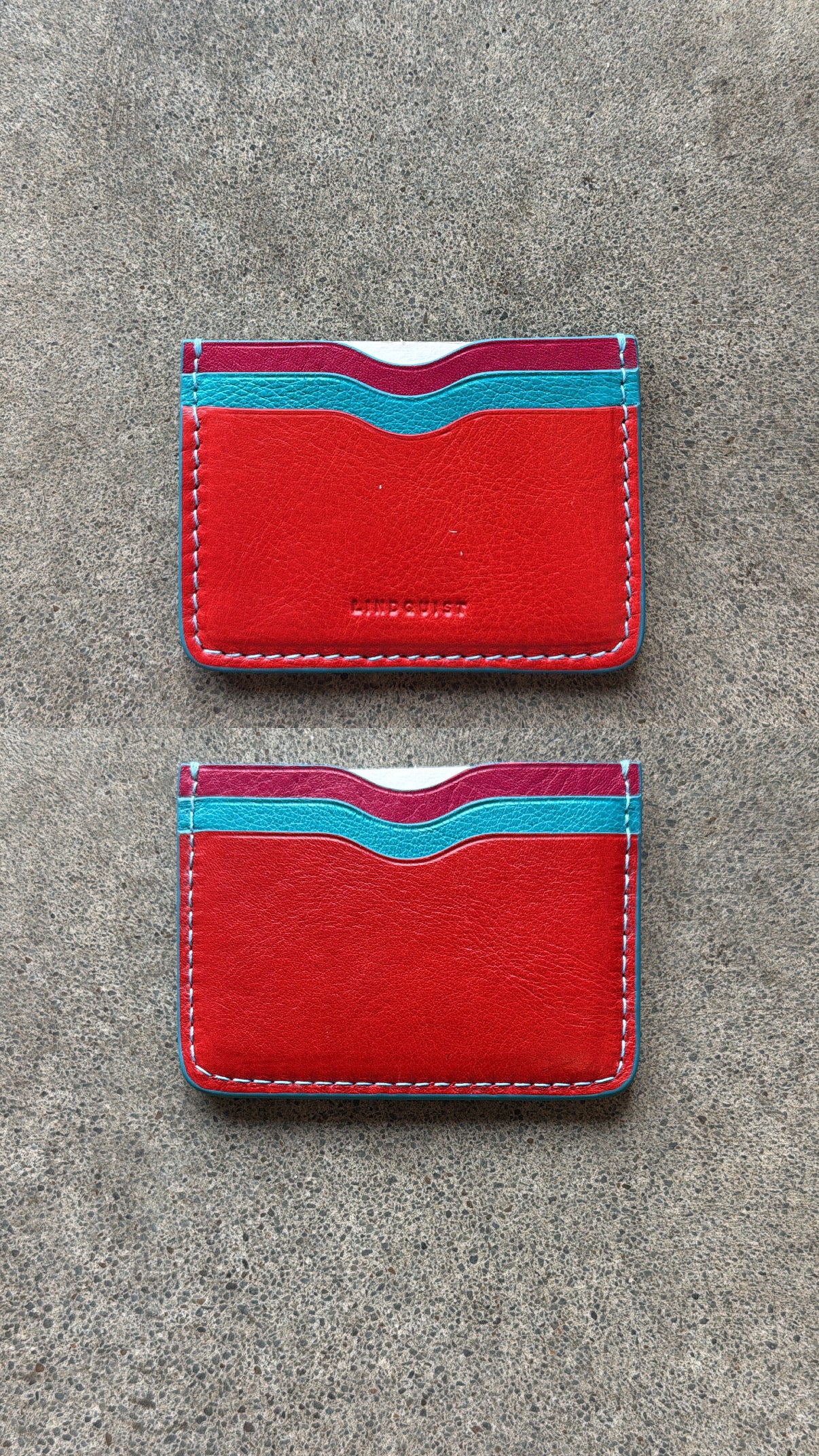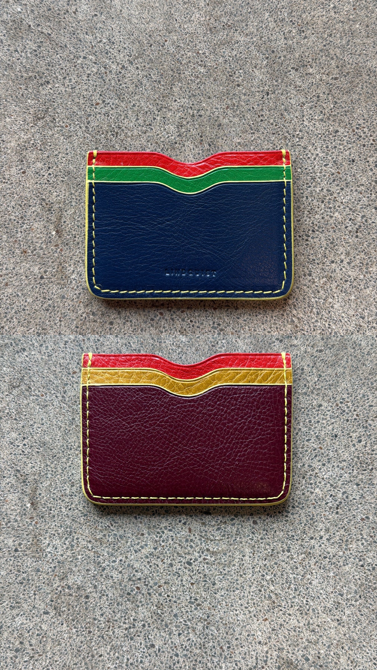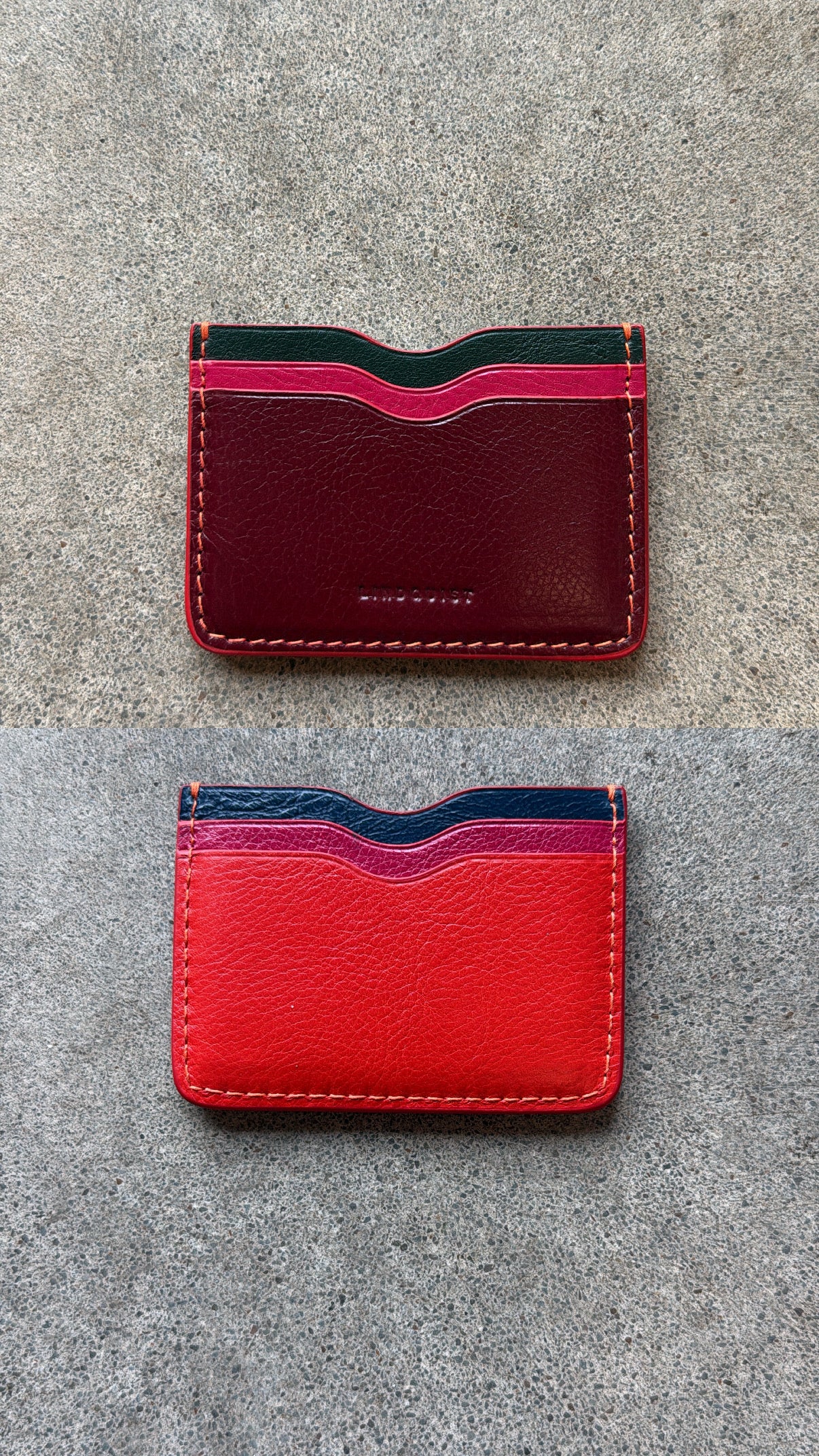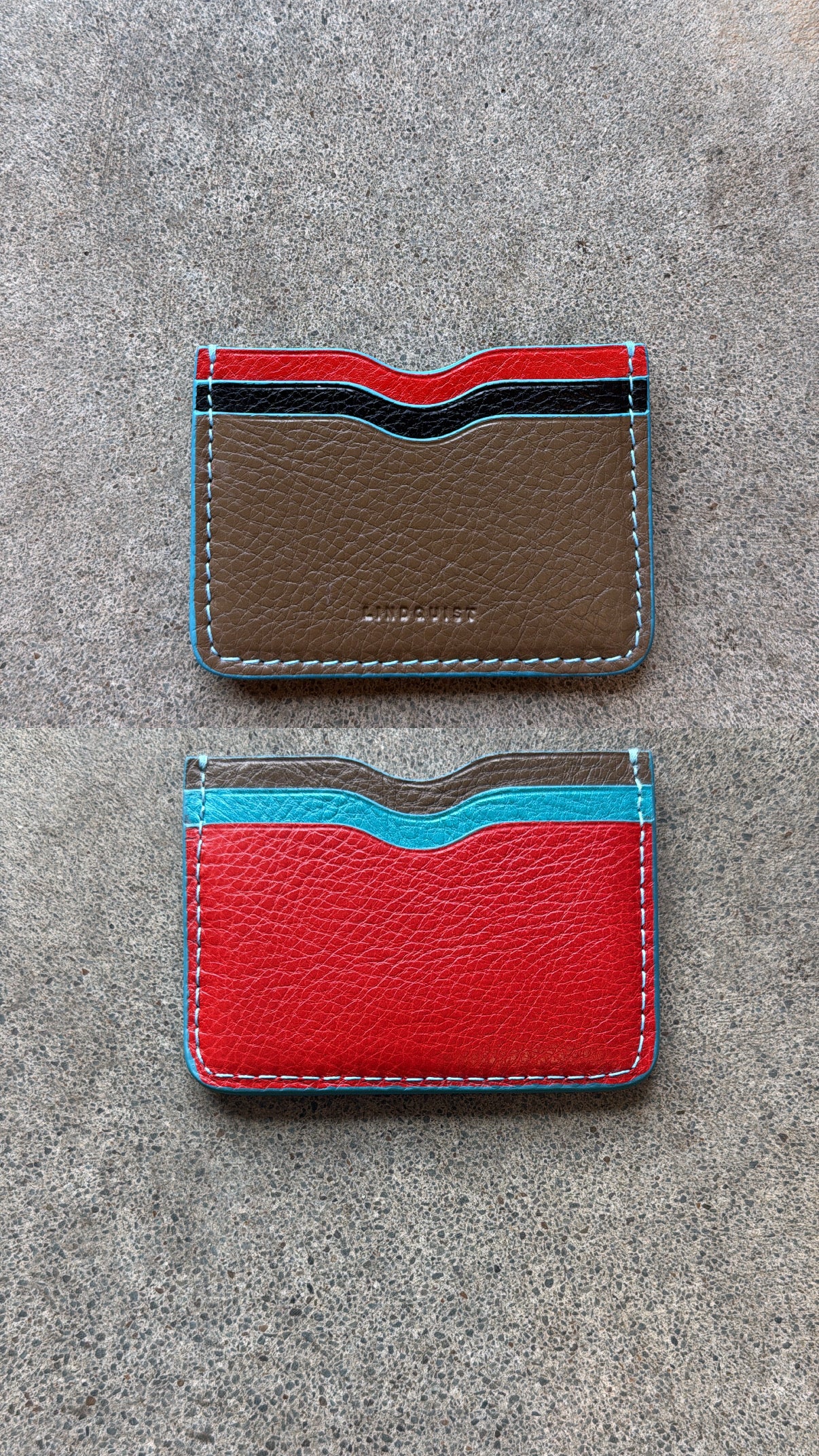 Each wallet has a unique color combination and painted edge. Please double check your order to make sure you’re selecting the correct color combination. For ease of ordering, we gave each a number and the colors describe the front (with logo) and the back main color.