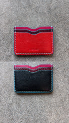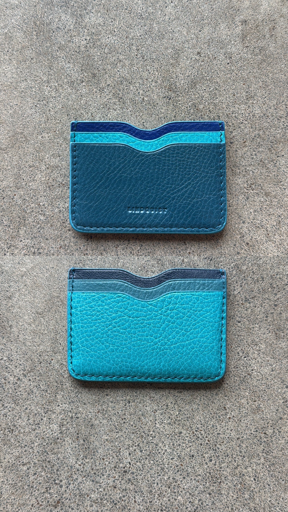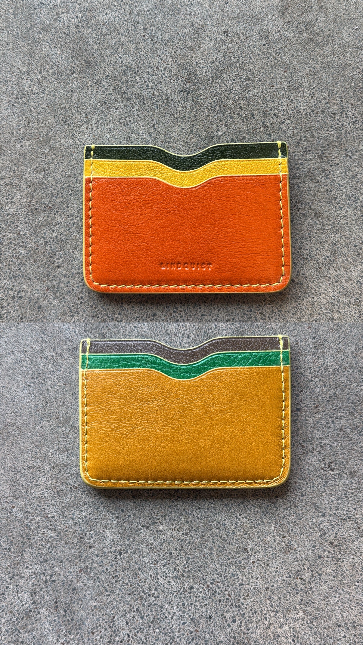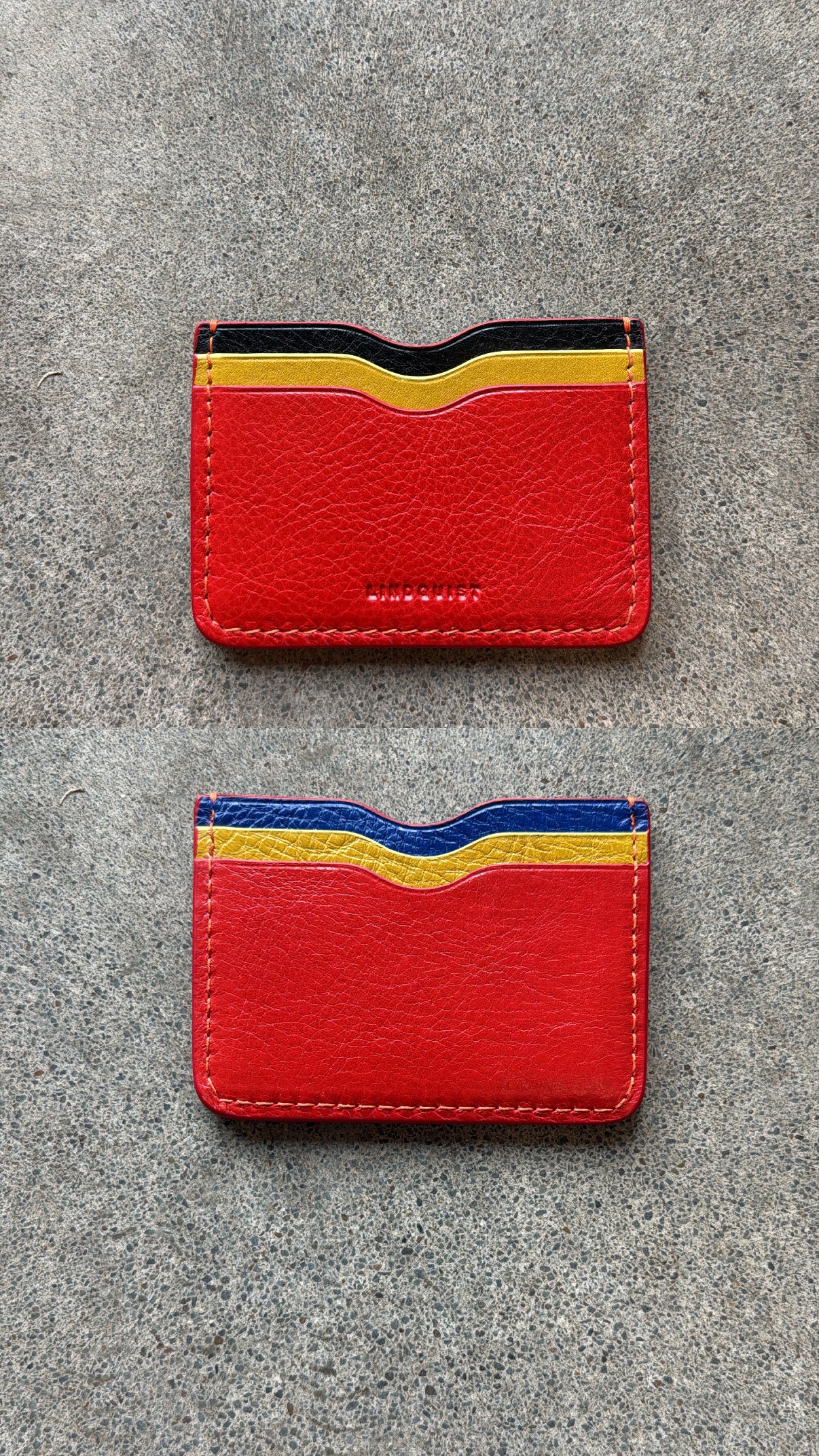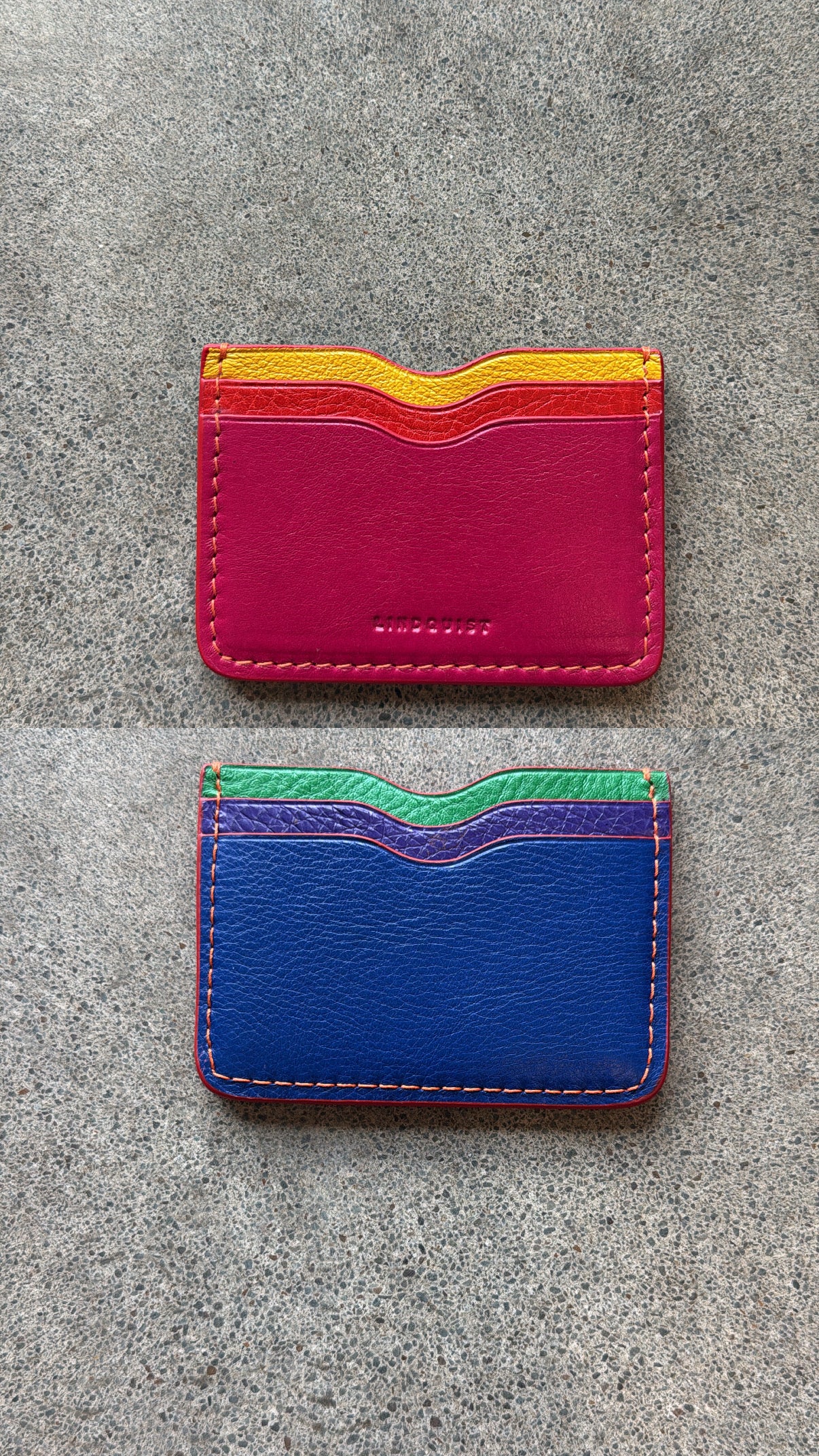 Each wallet has a unique color combination and painted edge. Please double check your order to make sure you’re selecting the correct color combination. For ease of ordering, we gave each a number and the colors describe the front (with logo) and the back main color.