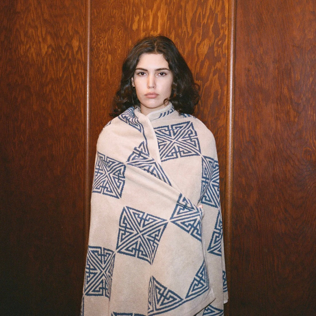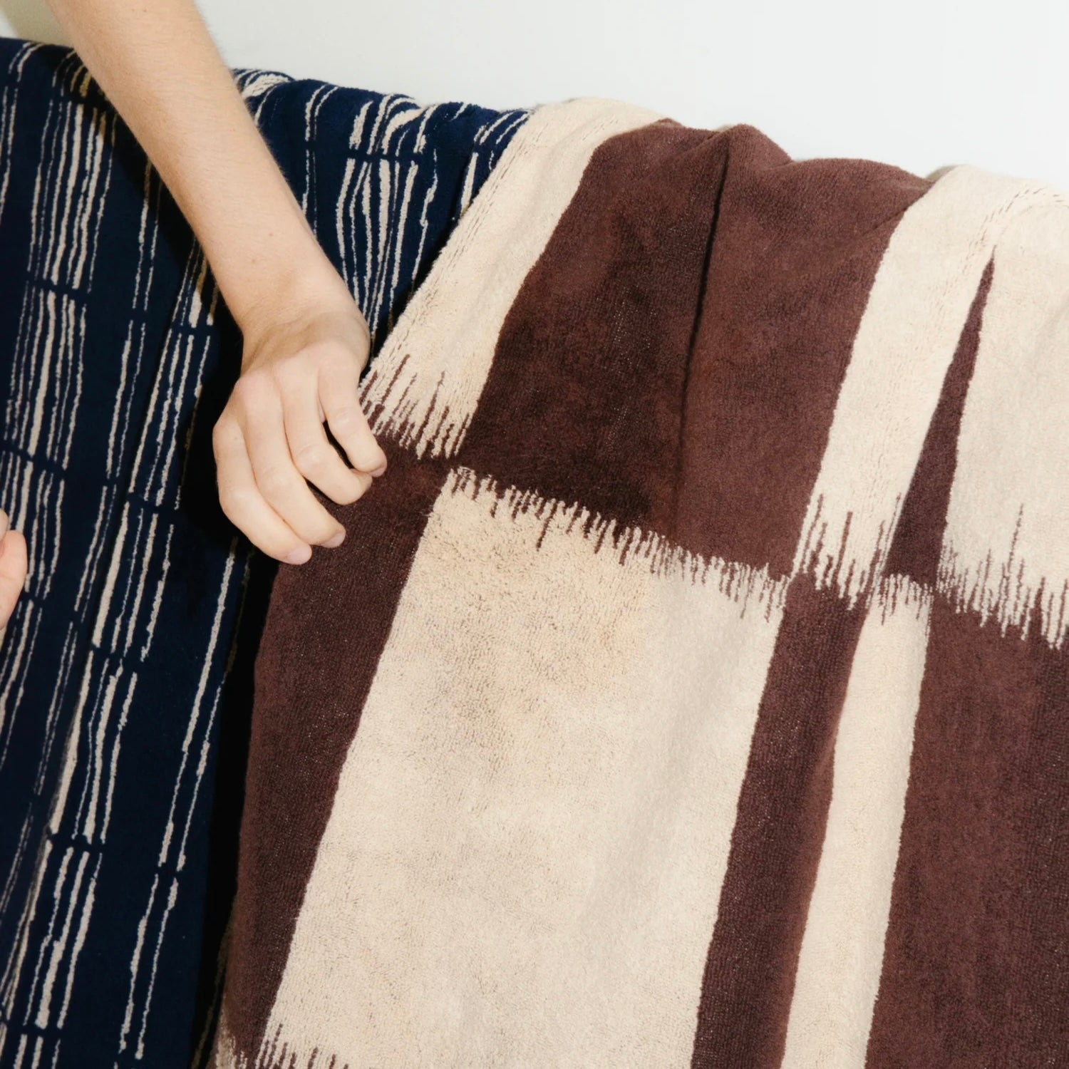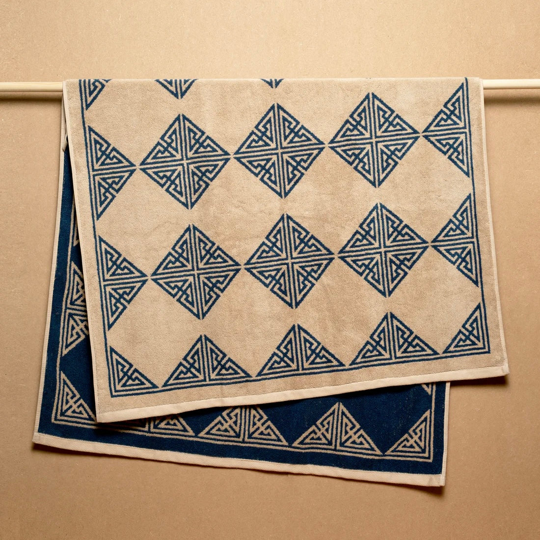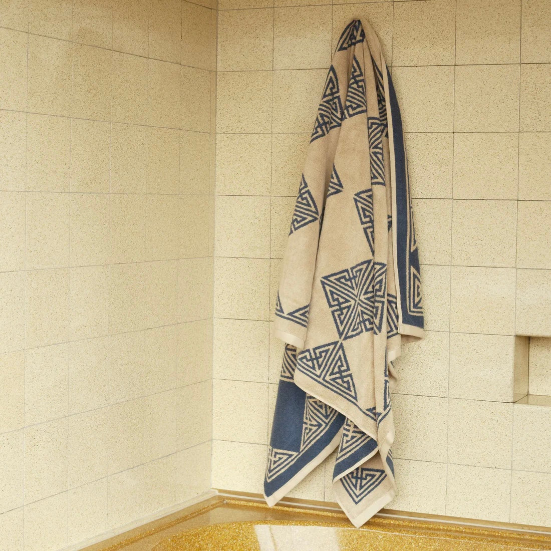 Agnes (Marine & Ecru) — A careful study in Southern Italian tile technique, this design recalls the understated simplicity of the Mediterranean. The marine blue details of this bath sheet stand out against a refined oat background.