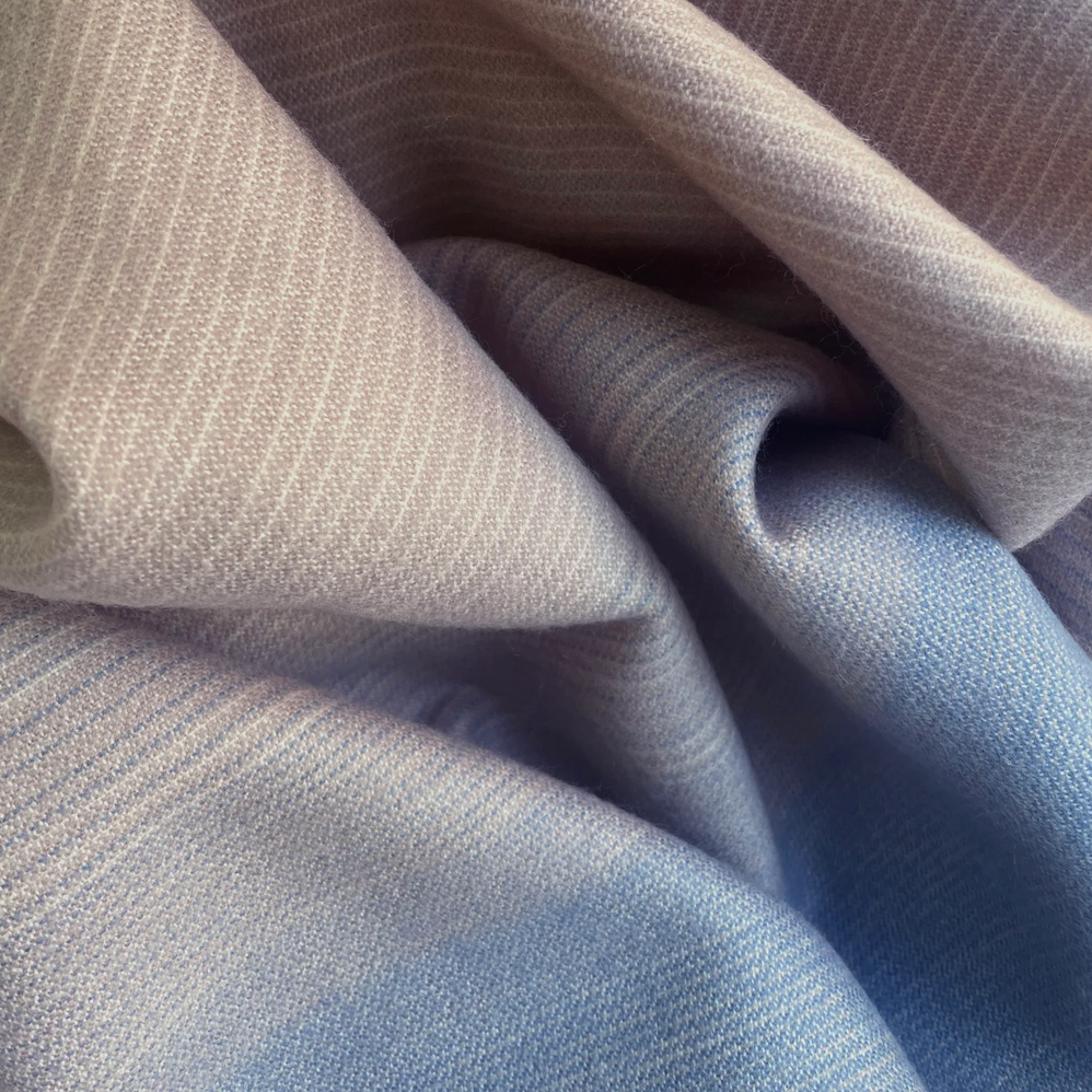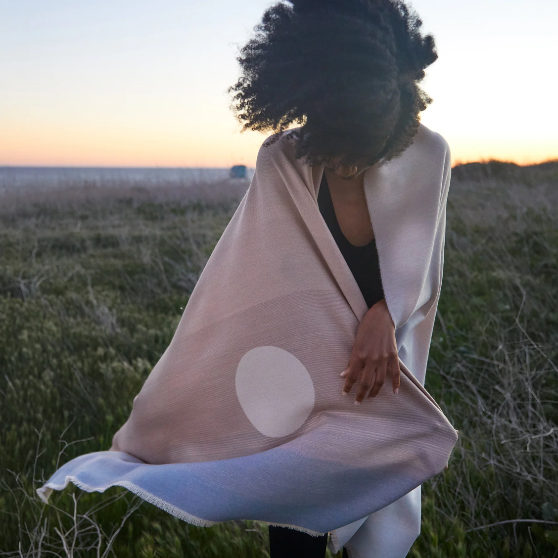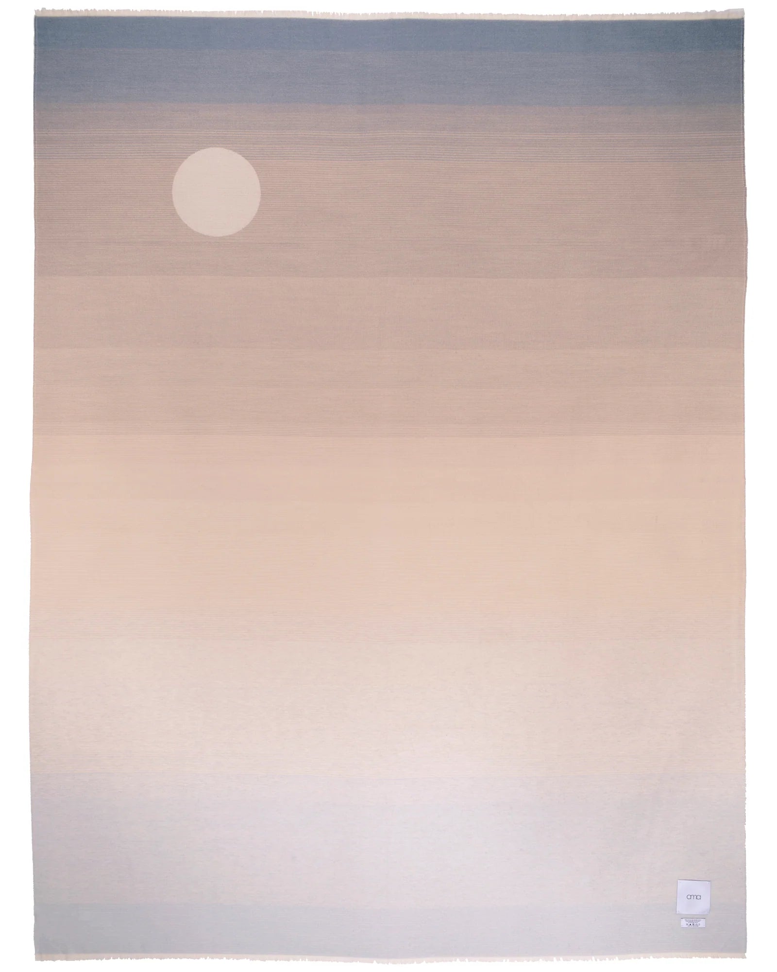 Reminiscent of a moonlit desert sky, the gentle palette of the Full Moon Throw is a gradient of fawn, sand, taupe, and dusky cobalt. The reverse side is a soft gradient of ivory to taupe. Combining a luxurious feel with comforting warmth, it is a gender-neutral complement to any home. AMA throws are encouraged to be worn on the body. Also available in a child-sized blanket.