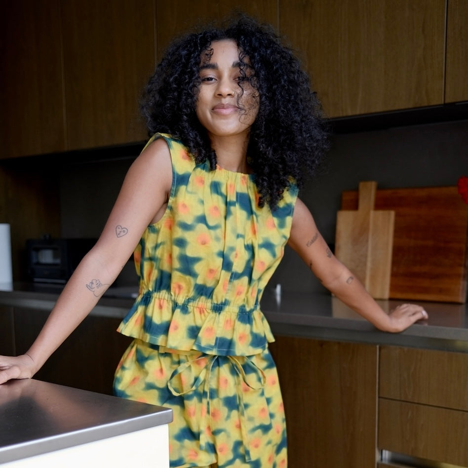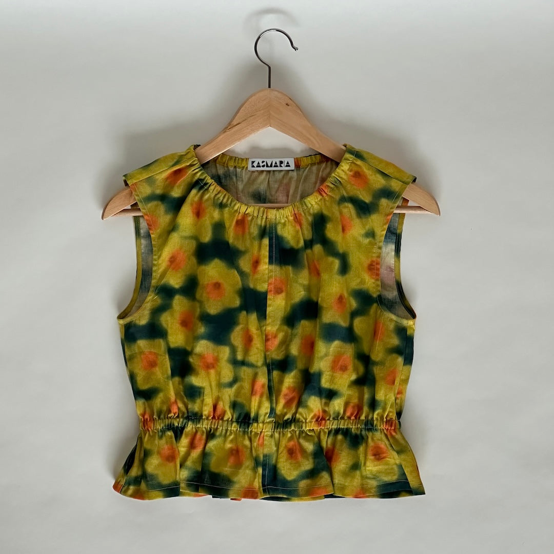 A flattering little summer cropped top with elastic waist and neckline. Made with Liberty fabric. 55% linen 45% cotton. Made in NYC