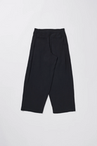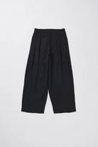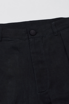 A pair of unisex relaxed fit trousers, featuring pleat detail on the side seam amplifying ease, made in handwoven linen in black.