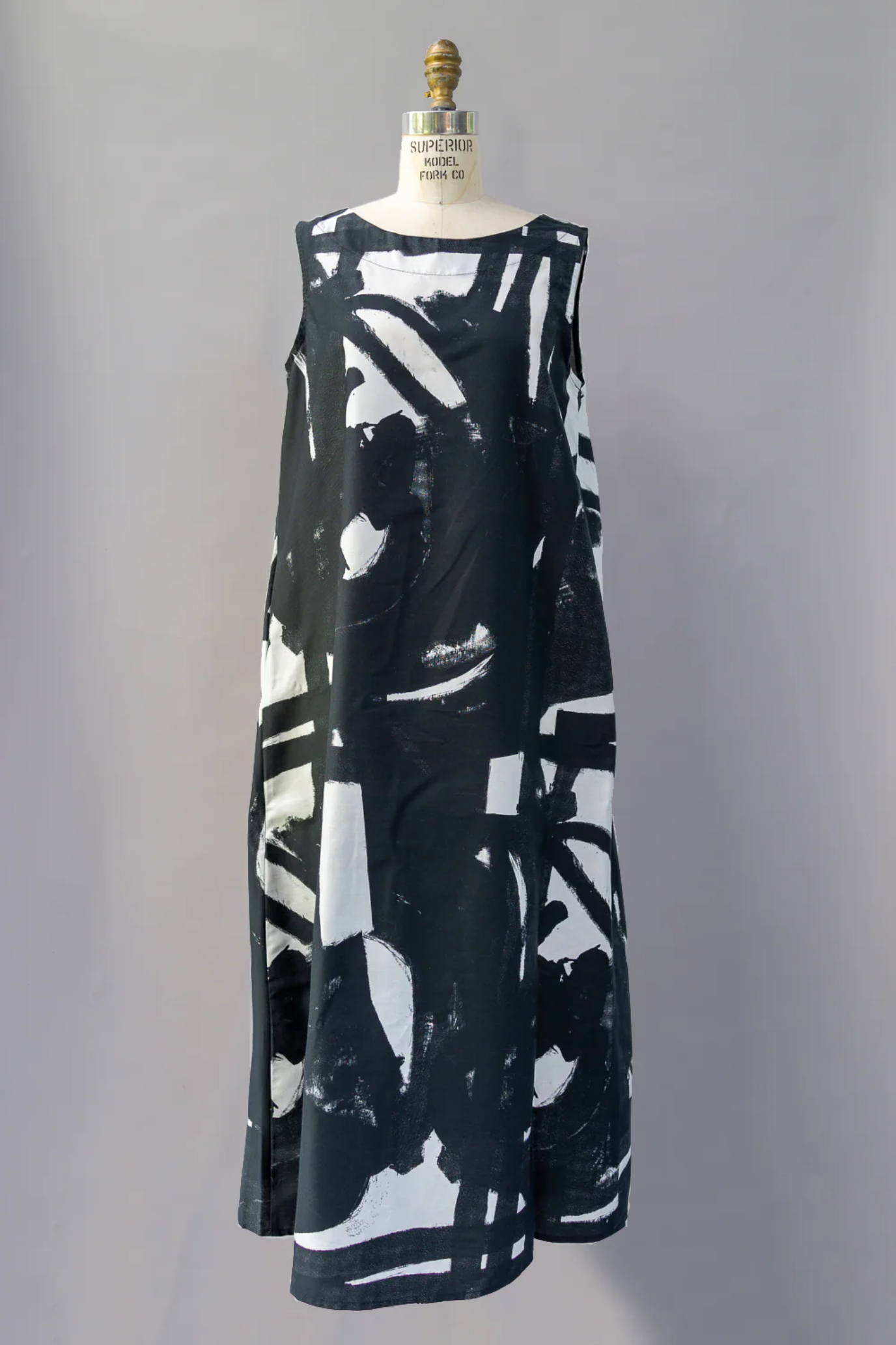 Classic bateau neck, a-line dress with on seam pockets. Interior finishing Includes bias arm holes and sewn down facings. The cotton twill has a smooth draping hand and is a medium weight fabric. Given the white ground of the dress we suggest nude colored undergarments. Maxi length. Three sizes.