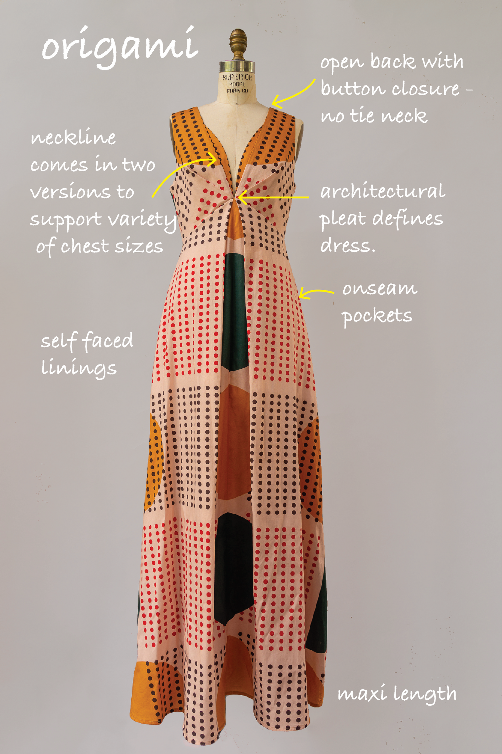 With a deep plunge in the front and open back, Origami is a special occasion dress for any time you need to make an entrance. Lined skirt and very comfortable back closure makes this dress surprisingly easy to wear.