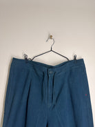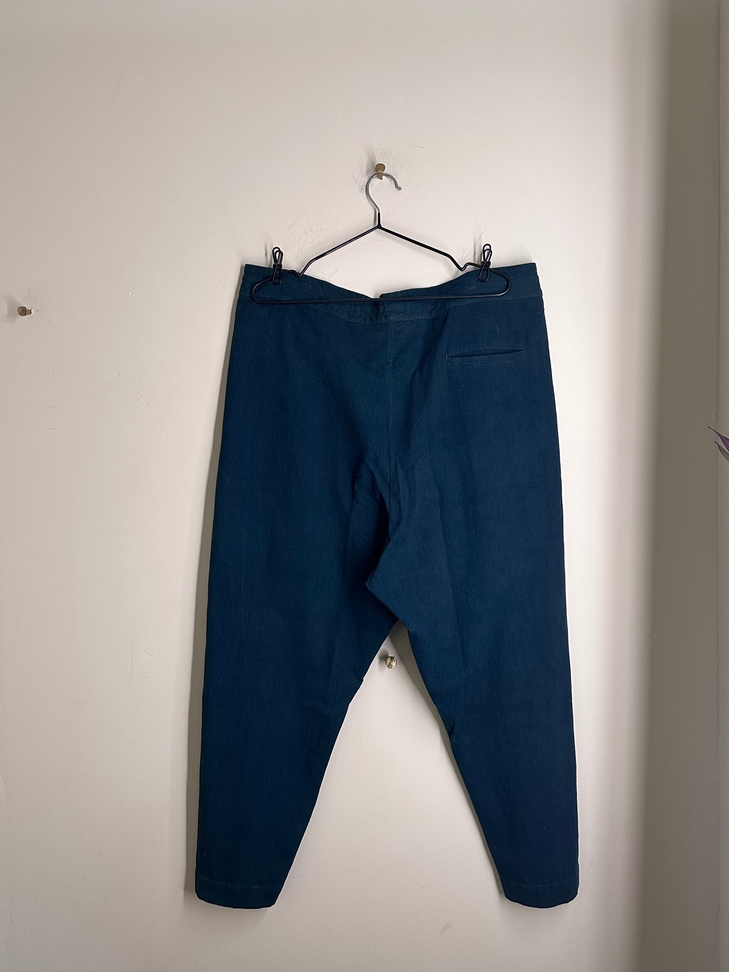 A oversized fit drawstring pleated pants with tapered bottom. Crafted with carefully composed panels of 40's count handspun and handwoven fabric in bottle green.