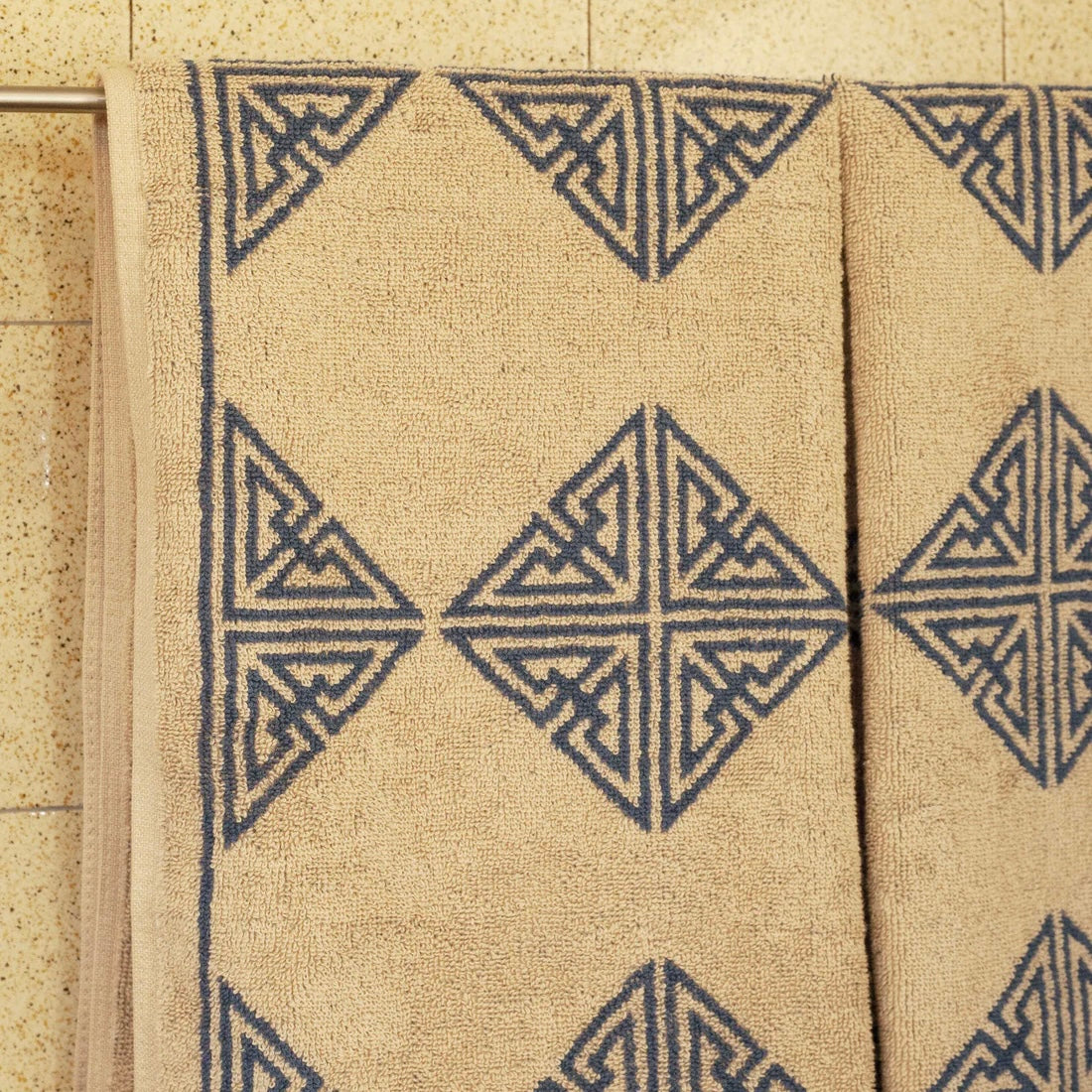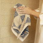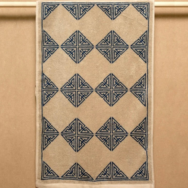 Agnes (Marine & Ecru) — A careful study in Southern Italian tile technique, this design recalls the understated simplicity of the Mediterranean. The marine blue details of this bath sheet stand out against a refined oat background.
