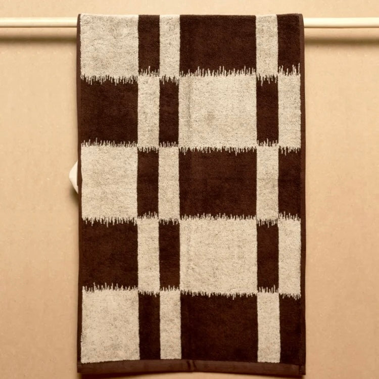 Karin (Walnut & Ecru) — Inspired by traditional Ikat weaving techniques, this ultra-sophisticated bath mat is fully reversible. The artisanal pattern is comprised of two tones in a low-key landscape of walnut and ecru.