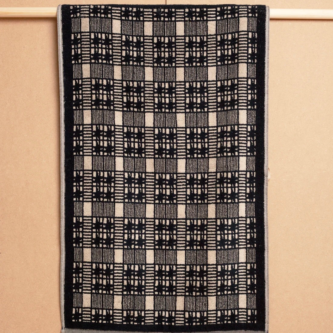 Alma (Black & Ecru) — This two-tone checkered design is inspired by traditional Katazome stencil practices. This fully reversible pattern in black and cream embraces the unpredictable rhythm of daily use — maintaining appeal whatever the fold or drape.