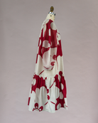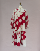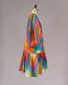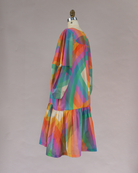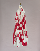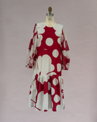 The Bib is our version of the traditional Holoku. Our version has an elongated bib accompanied with a sharp, gather free balloon sleeve. Almost architectural in its shape, a distillation of the form to its essence. Knee length with on seam pockets, lined bib front and shell button detail in the back. Long hem ruffle.