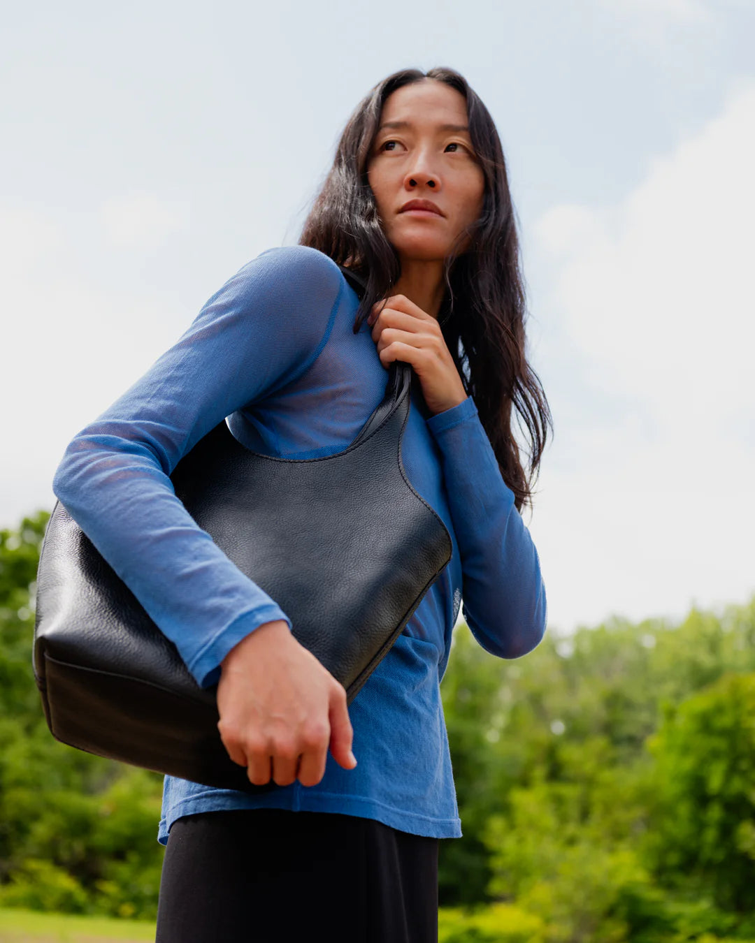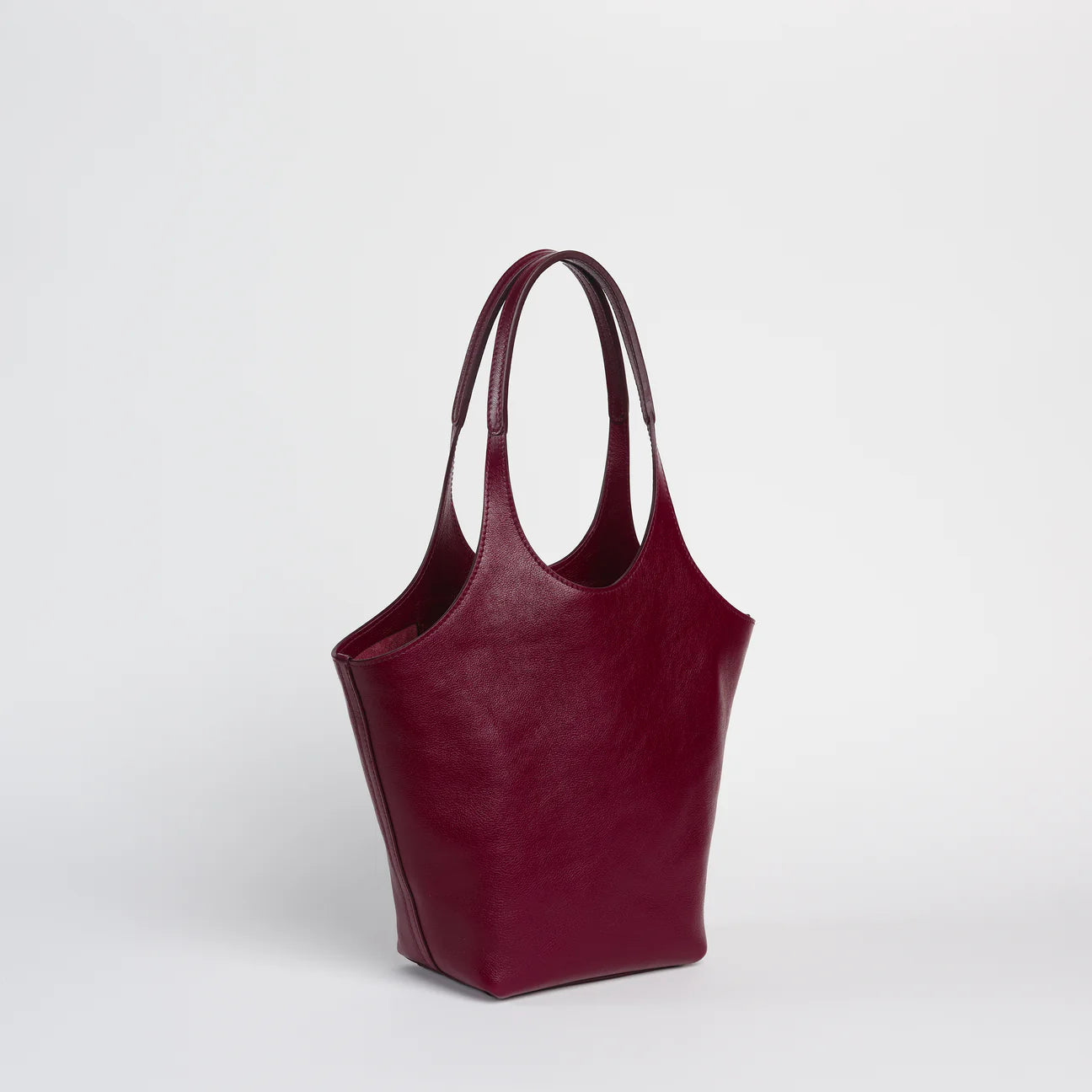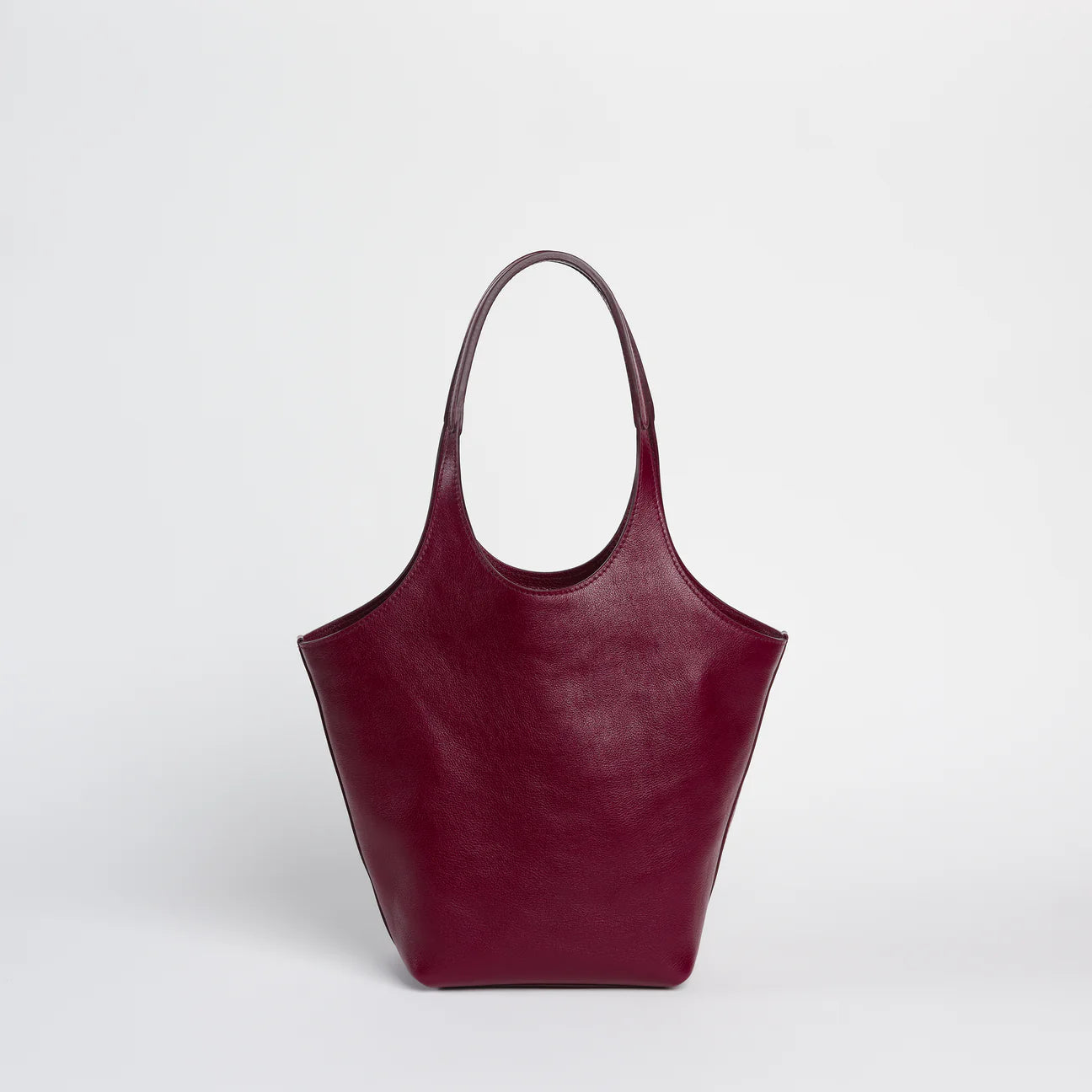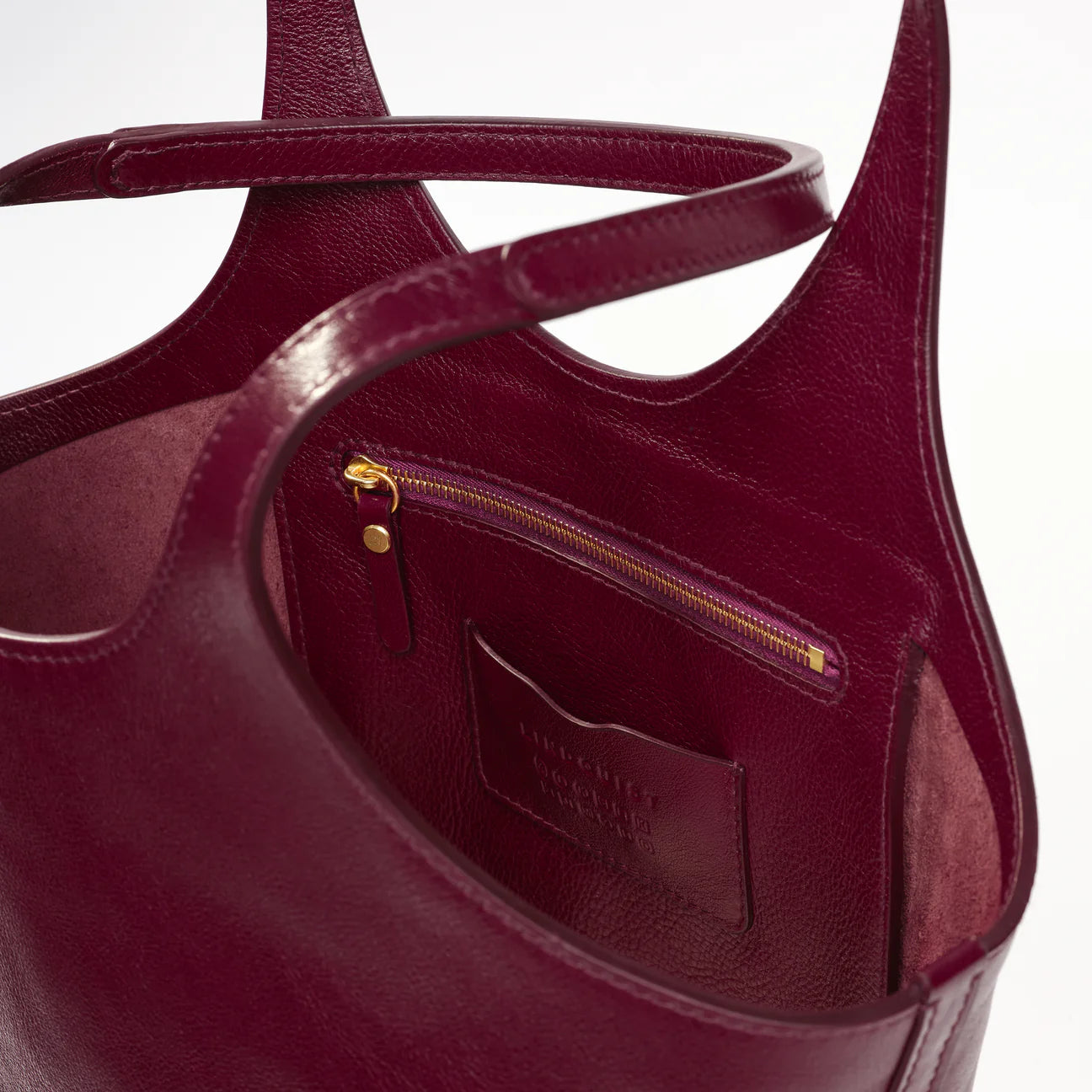 A perfectly proportioned shoulder carry bucket tote that widens gradually to form an undulating swooped top edge, featuring double layer oval handles and an interior drop pocket with zipper and card slot.