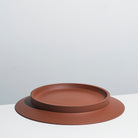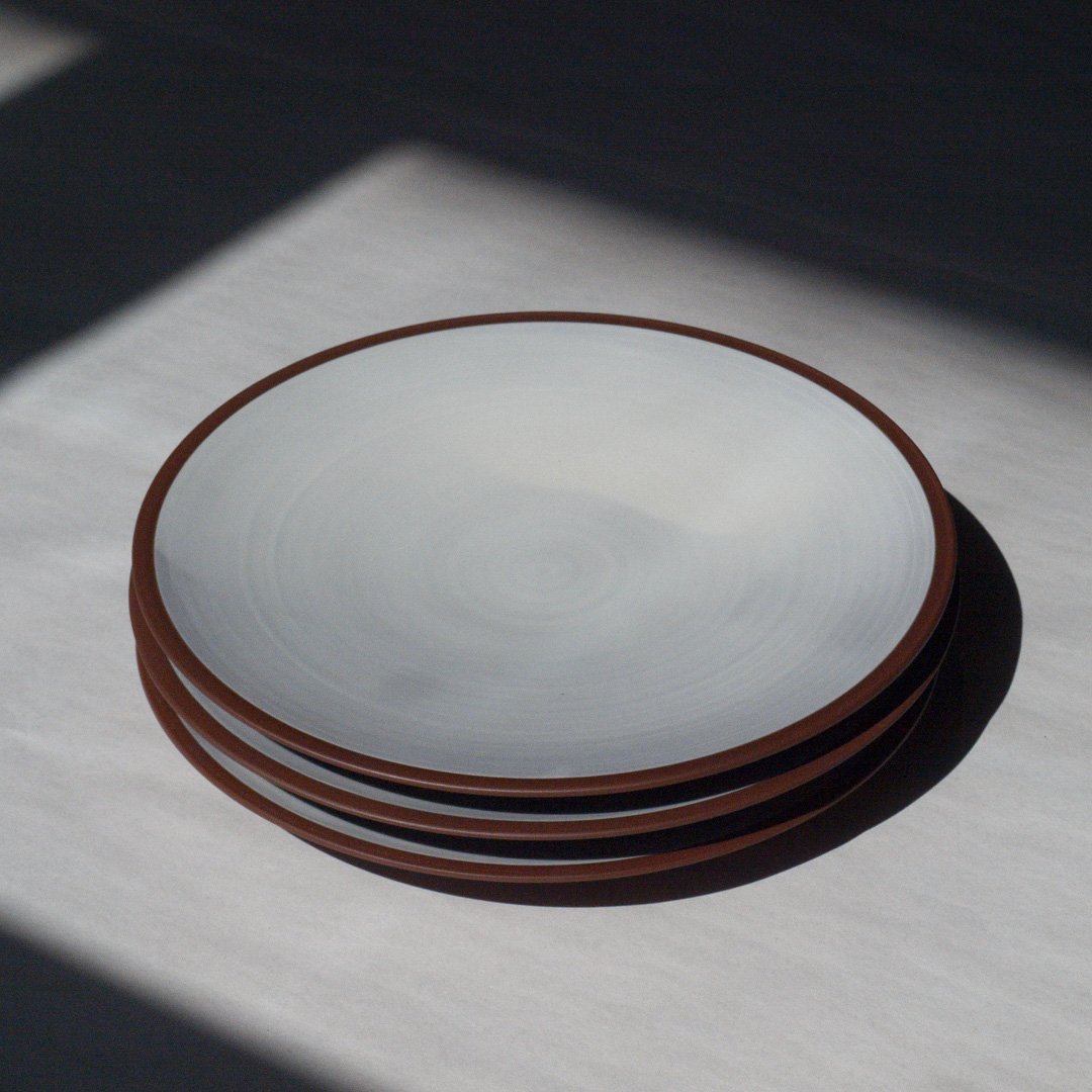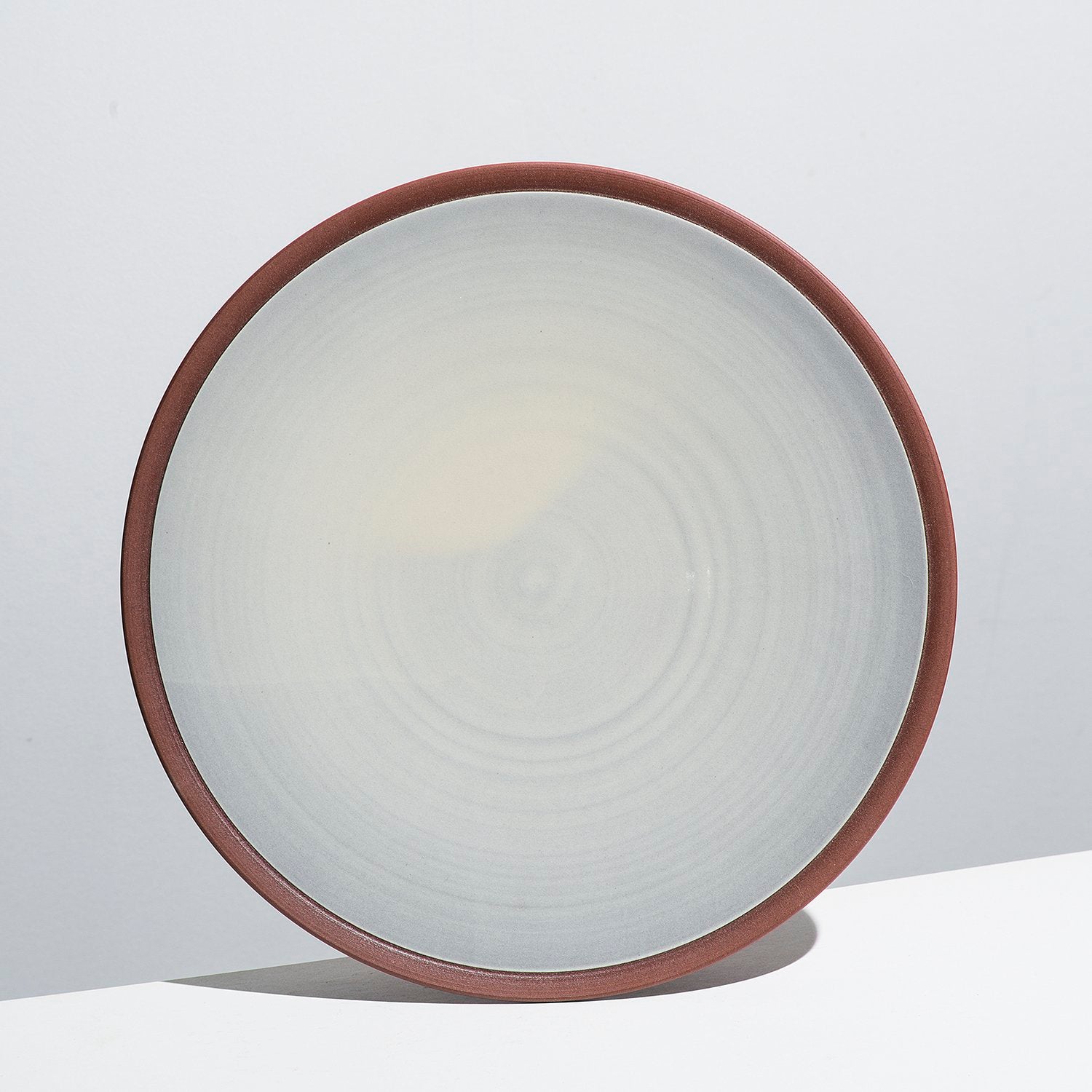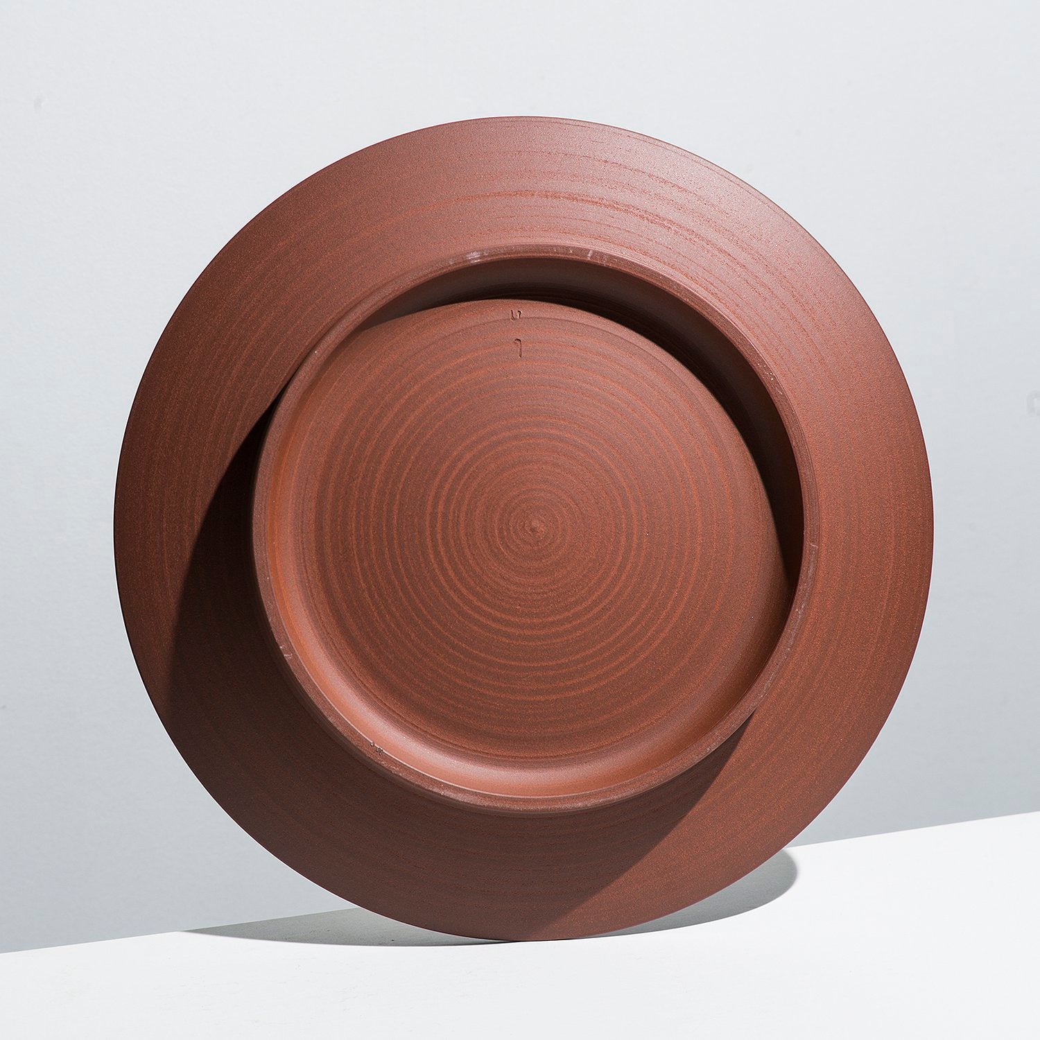 A large handmade plate with a slightly hollow surface. The inner curve is continuous and the foot raises the plate, making it float on the table while ensuring its stability.