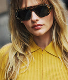 MYRTLE was inspired by Gena Rowlands' thespian character in the 1977 cult film Opening Night. This oversized geometric aviator frame with gold metal deco certainly delivers the drama.
