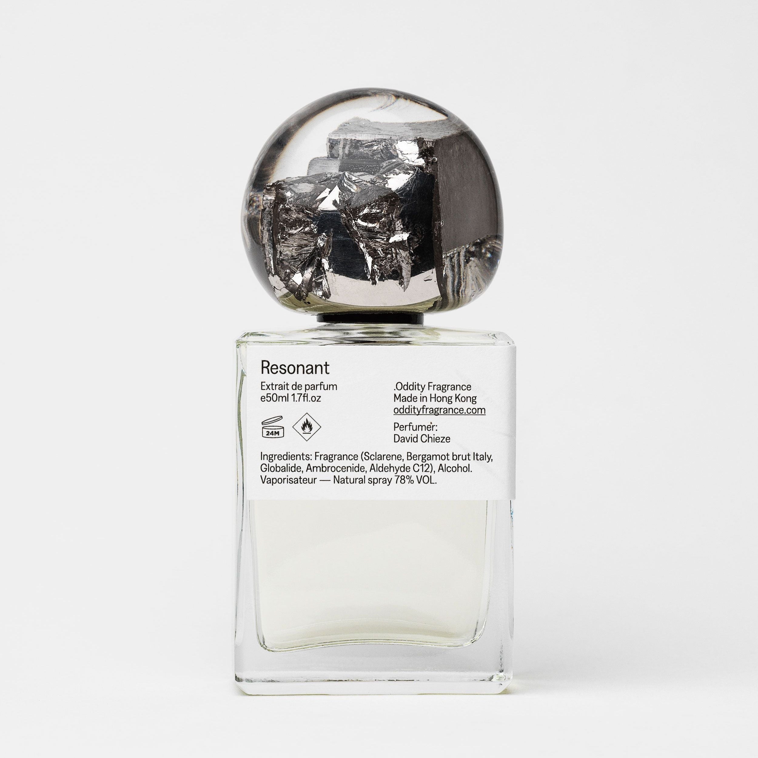 Oddity perfumes are crafted in small batches, using rare and rich ingredients, making them quite a distinguishing smells. Bottle caps for Resonant are made by hand from imperfectly beautiful bismuth encapsulated in epoxy resin resulting in unique shapes and shades, each is one of a kind — a true masterpiece.