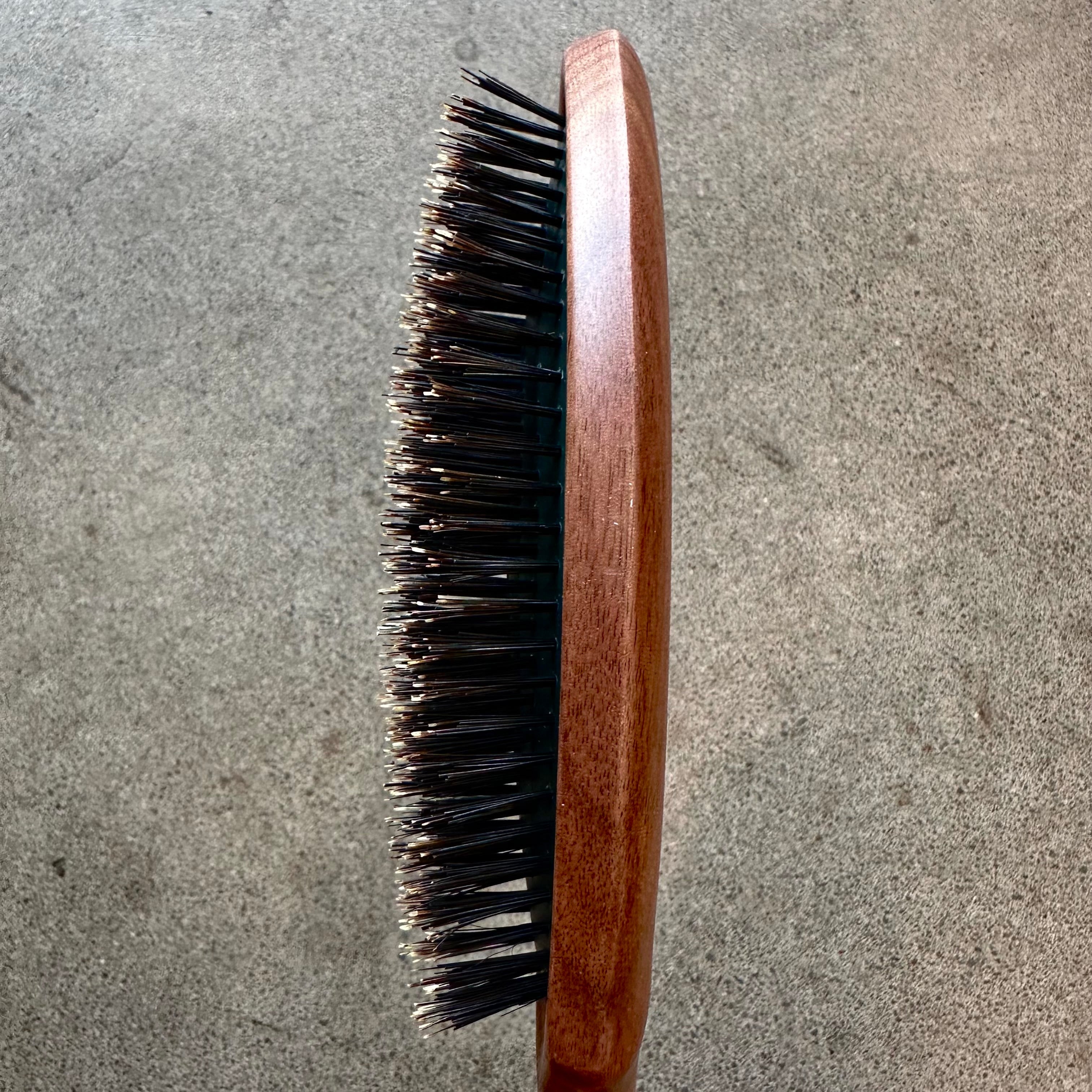 Walnut wood handle with natural boar and black pig hair bristles. Since natural boar and pig hair contain oil, static electricity (the great enemy for beautiful hair) is avoided. Bristles have moderate elasticity and hardness, so the hair isn’t excessively burdened but the scalp is stimulated, blood circulation is improved and a massaging effect is obtained.