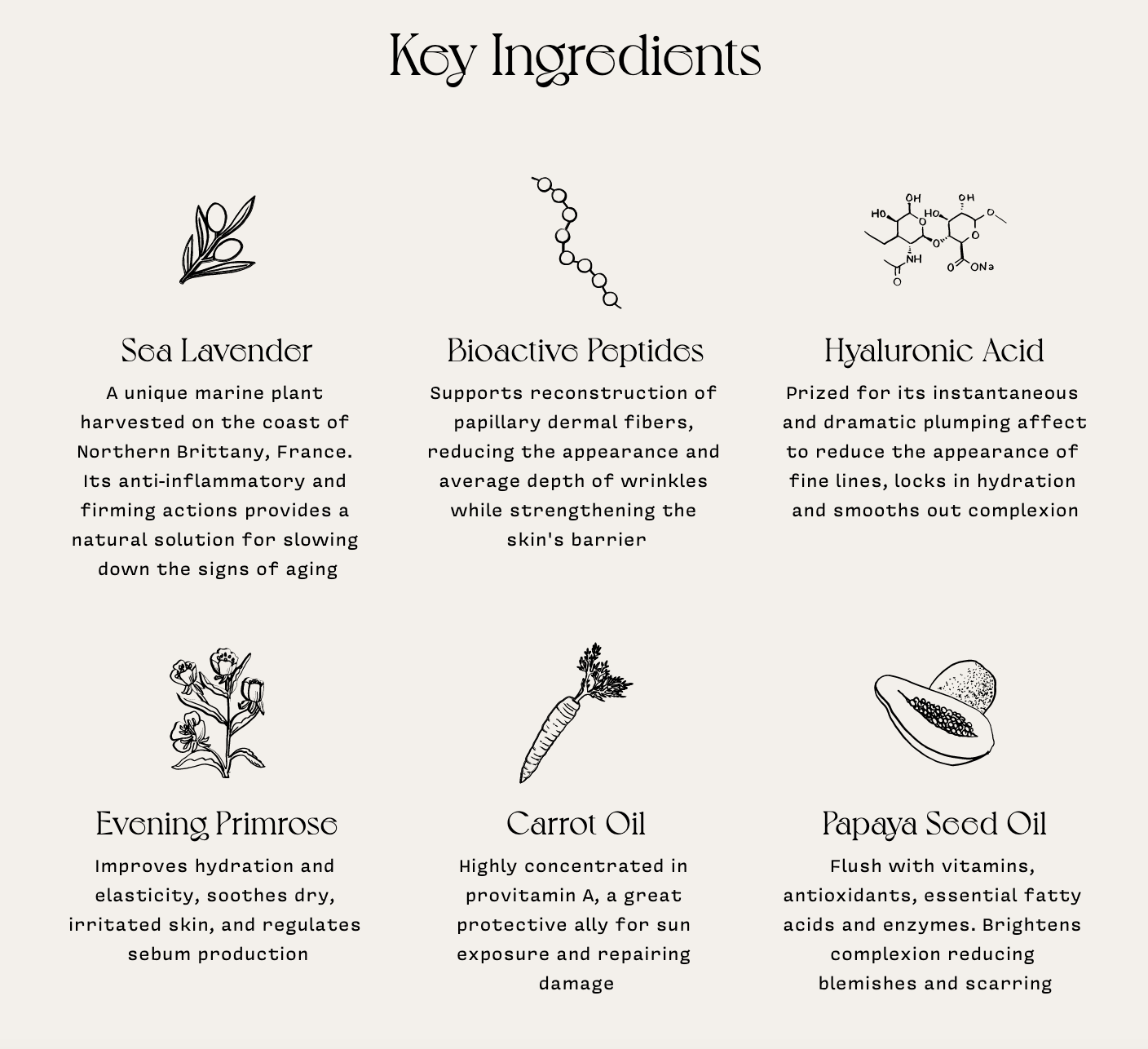 Vitis Vinifera (Grape) Seed Oil, Persea Gratissima (Avocado) Oil, Mangifera Indica (Mango) Seed Oil, Rosa Canina (Rosehip) Seed Oil, Oenothera Biennis (Evening Primrose) Oil, Carica Papaya (Papaya) Seed Oil, C12-15 Alkyl Benzoate, Olea Europaea (Olive) Fruit Oil, Caprylic/Capric Triglyceride, Rosmarinus Officinalis (Rosemary) Essential Oil, Bisabolol, Sorbitan Laurate, C18-36 Acid Glycol Ester, C18-36 Acid Triglyceride, Limonium Gerberi (Sea Lavender) Extract, Palmitoyl Tripeptide-1, Palmitoyl Tetrapeptide-7, Ascorbyl Palmitate (Vitamin C), Hippophae Rhamnoides (Sea Buckthorn) Fruit Oil, Daucus Carota (Carrot) Oil, Curcuma Longa (Turmeric) Root Oil, Hydrogenated Castor Oil, Cymbopogon Martini (Palmarosa) Oil, Pelargonium Graveolens (Geranium) Flower Oil, Ricinus Communis (Castor) Seed Oil, Rosmarinus Officinalis (Rosemary) Leaf Oil, Sodium Hyaluronate, Lavandula Angustifolia (Lavender) Flower Oil